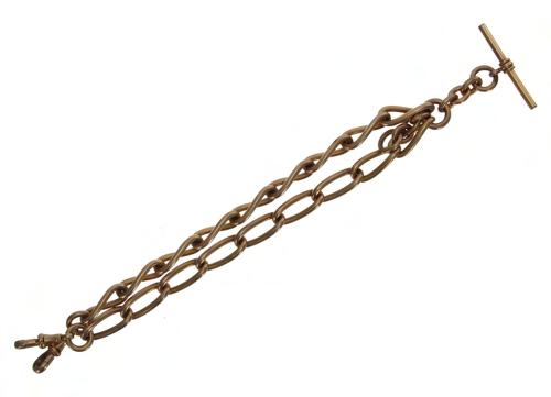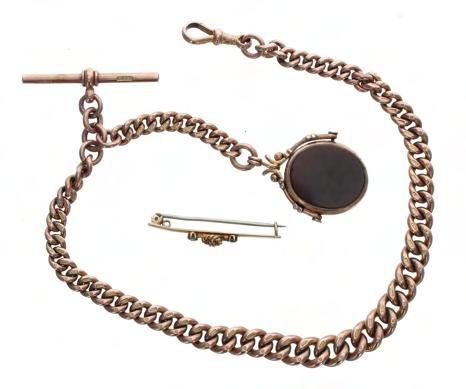 Good 9ct rose gold graduated watch Albert chain, with T-bar, lever clasp and a 9ct swivel fob, each link hallmarked, 65.5gm, the chain 13" long ; also with a 9ct diamond set bar brooch, 1.6gm, 38mm wide