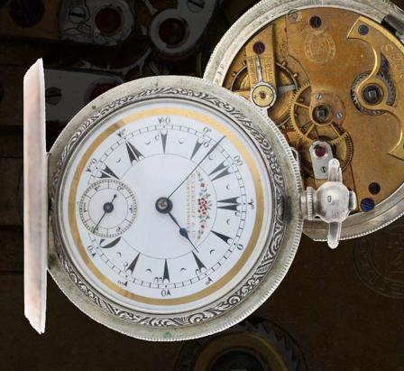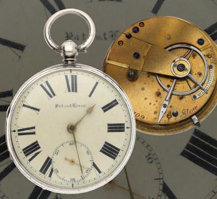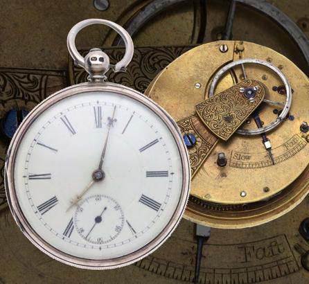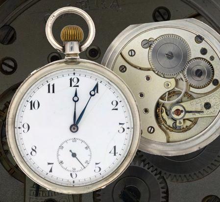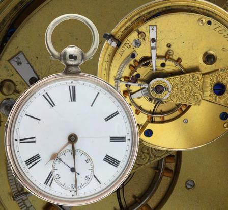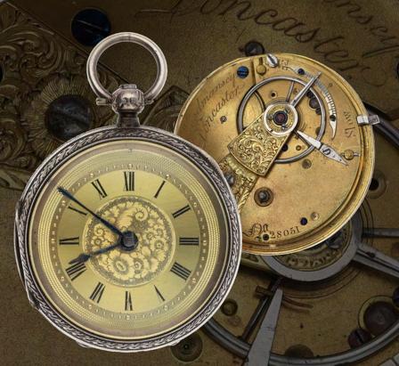 Silver pocket watch case; together with two pocket watch dials, pocket watch movement parts and a small selection of pocket watch keys