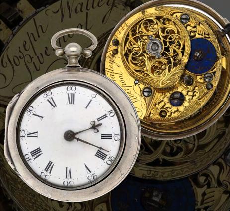 Joseph Walley, Liverpool - George III silver pair cased verge pocket watch, London 1770, the signed fusee movement, no. 2444, with pierced engraved balance cock, diamond endstone, flat steel three arm balance, regulating disc and square baluster pillars, signed and numbered dust cover, enamel dial with Roman numerals, outer Arabic five minute divisions and minute markers, beetle and poker hands, bullseye glass, plain matching cases, the inner case inscribed with the initial 'W*P' and the outer case faintly inscribed 'WP', case maker 'W.B', 51mm