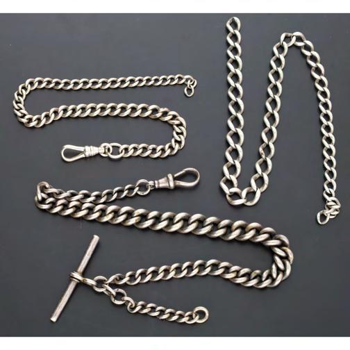 R. Wright Manufacturer silver fusee lever engine turned pocket watch for repair, 50mm; key (movement and case at fault); together with a silver graduated curb link watch chain with silver T-bar and silver clasp, 12'' long approx and a white metal watch chain with T-bar and clasp (3)