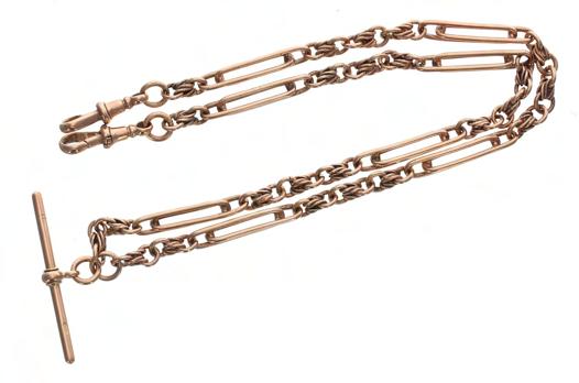963. 9ct rose gold Figaro link double watch Albert chain, with 9ct T-bar and two clasps, 36.6gm, 19.5'' approx