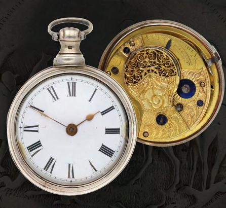Samuel Weldon, London - English 18th century silver pair cased verge pocket watch, signed fusee movement, no. 17616, with a sprung three-arm balance, finely pierced and engraved winged balance cock with broad foot, silvered regulating dial and square baluster pillars, enamel white dial with Roman numerals and outer arcaded Arabic five minute chapter, steel beetle and poker hands, plain cases, 57mm