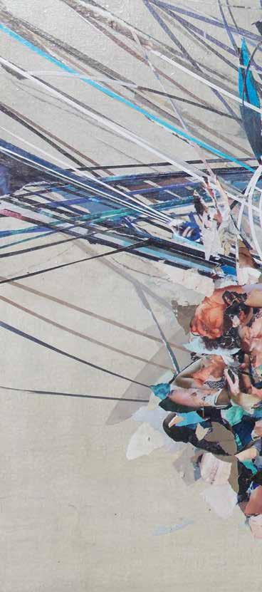 sorveglianza messe in atto grazie all’ausilio del web, nuovo panopticon (prigione ideale progettata da Jeremy Bentham nel 1791) in cui siamo noi stessi a rinchiuderci condividendo online i nostri dati personali, pezzetti della nostra identità. Il collage diventa così rappresentazione dell’individuo come entità frammentata e complessa e la scelta del dittico si carica di significato concettuale: nel vuoto, nel distacco tra i due elementi si crea un nucleo in cui convergono tensioni generando uno spazio fatto di false prospettive e illusioni in contrasto con un dina mismo universale ordinato e controllato. Un’atmosfera che racconta assenza di punti di riferimen to la si ritrova anche nella serie Misfits, titolo traducibile come “i disadatti”. In queste opere, l’artista sottolinea ancora meglio un’umanità pervasa dall’inquietudine, fatta di individui persi e trascinati in quel turbinio e incapaci di trovare un baricentro stabile. Con le opere Frattale e Downburst Beltrami allude a due fenomeni naturali proponendoli come metafore della società. Il frattale è una composizione geome trica che si ritrova, ad esempio, nella struttura di molte specie vegetali, nei profili geomorfologici delle monta gne, nelle nuvole e presenta un rapido susseguirsi di rappresentazioni prospettiche che, ripetendosi all’infinito creano un oggetto omotetico, una copia di sé stesso su scale differenti che s’ingrandisce proporzionalmente. L’artista reinterpreta questo fenomeno rappresentando un vortice in movimento di cui possiamo percepire la rotazione, dove la velocità porta il soggetto a perdere
