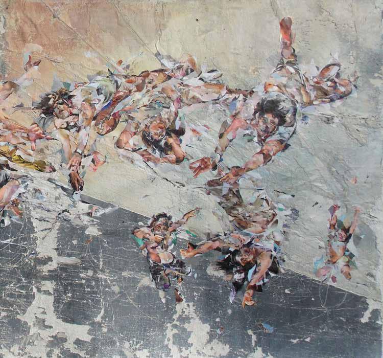 Recentemente, in alcune opere, appaiono vortici di soli segni, quasi a significare la volontà di “ridurre” la fi gurazione per addentrarsi nell’astrazione, da cui deriva il titolo della mostra Lost in Translation (che può in tendersi come Persi nella traduzione oppure Persi nel cambiamento); comunque, non è che la figura umana scompaia del tutto, solo viene frantumata come, durante la pandemia, l’io di ognuno di noi si è quasi spezzato in vari frammenti e si è trascinato nel vortice della ma lattia. Ora, forse, l’individuo appare più isolato nella sua solitudine vorticosa oppure nella volontà di aggregarsi alle altre solitudini, in una massa che decenni addietro David Riesman chiamò “la folla solitaria”: quindi per