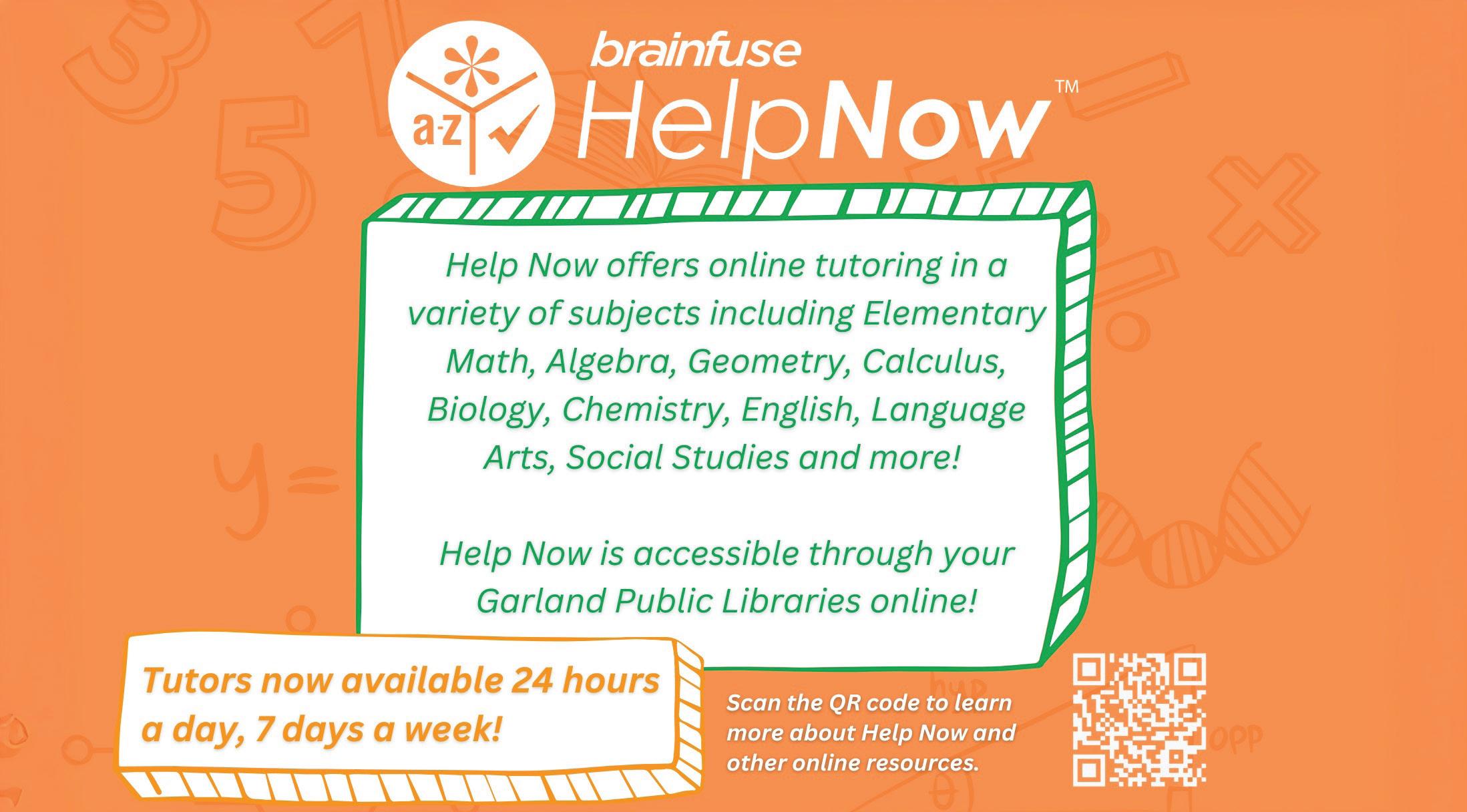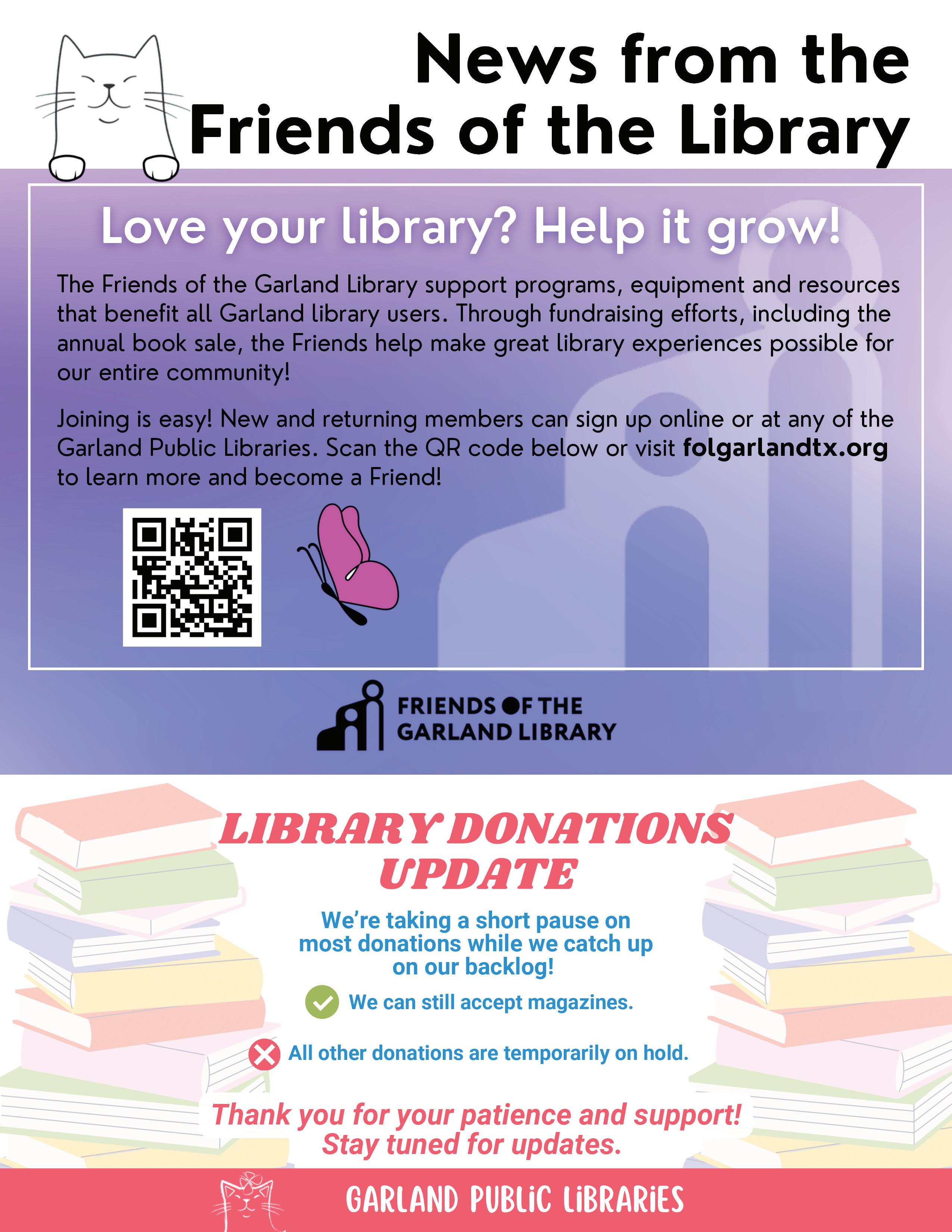 Request outreach services from your Garland library. If you would like us to host a booth or present information on library services and resources to your organization, visit our website, Library.GarlandTX.gov, click on Services, then Outreach Services, to fill out our Outreach Request Form.