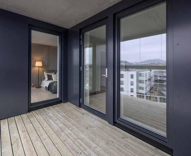 Alle vinduer og balkongdører har 105 mm karm i standard utførelse.