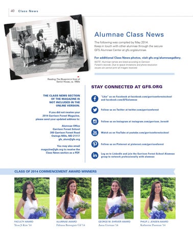 STAY CONNECTED AT GFS.ORG THE CLASS NEWS SECTION OF THE MAGAZINE IS NOT INCLUDED IN THE ONLINE VERSION.