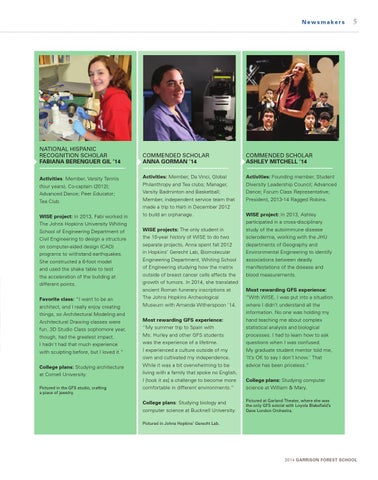 NATIONAL HISPANIC RECOGNITION SCHOLAR FABIANA BERENGUER GIL ’14 Activities: Member, Varsity Tennis (four years), Co-captain (2012); Advanced Dance; Peer Educator; Tea Club. WISE project: In 2013, Fabi worked in The Johns Hopkins University Whiting School of Engineering Department of Civil Engineering to design a structure on computer-aided design (CAD) programs to withstand earthquakes. She constructed a 6-foot model and used the shake table to test the acceleration of the building at different points. Favorite class: “I want to be an architect, and I really enjoy creating things, so Architectural Modeling and Architectural Drawing classes were fun. 3D Studio Class sophomore year, though, had the greatest impact. I hadn't had that much experience with sculpting before, but I loved it.” College plans: Studying architecture at Cornell University. Pictured in the GFS studio, crafting a piece of jewelry.