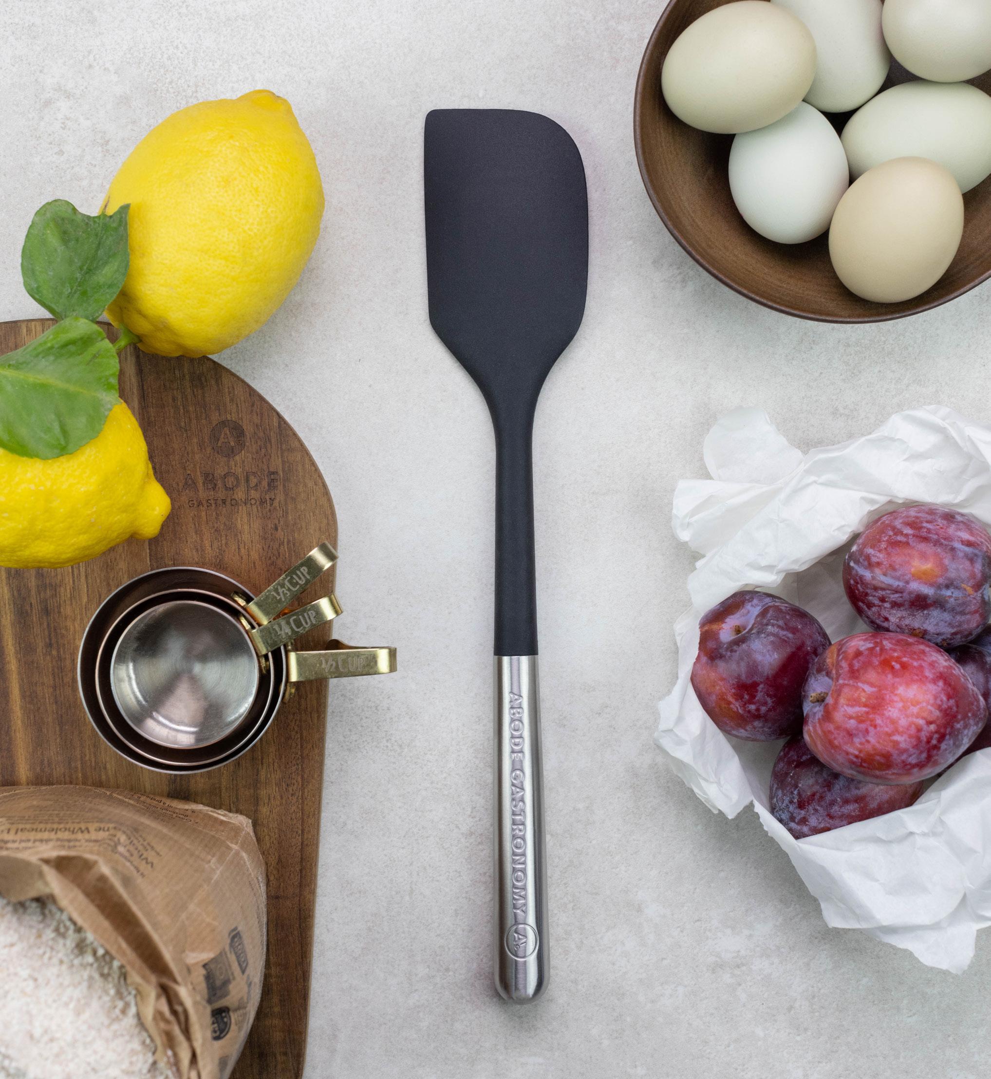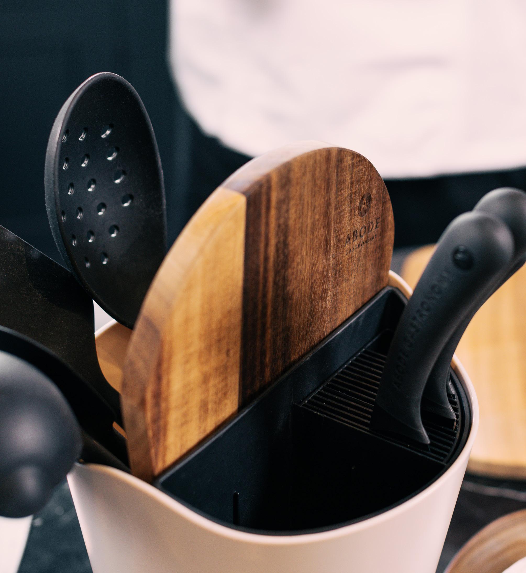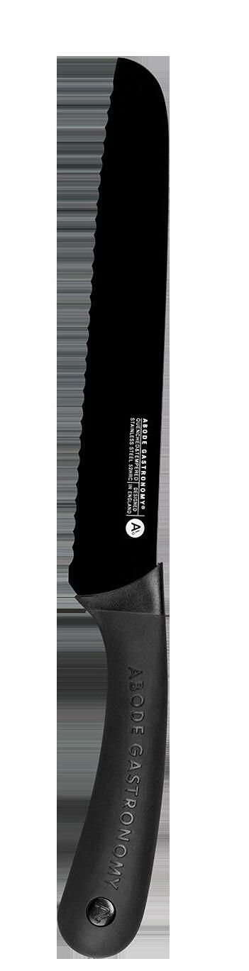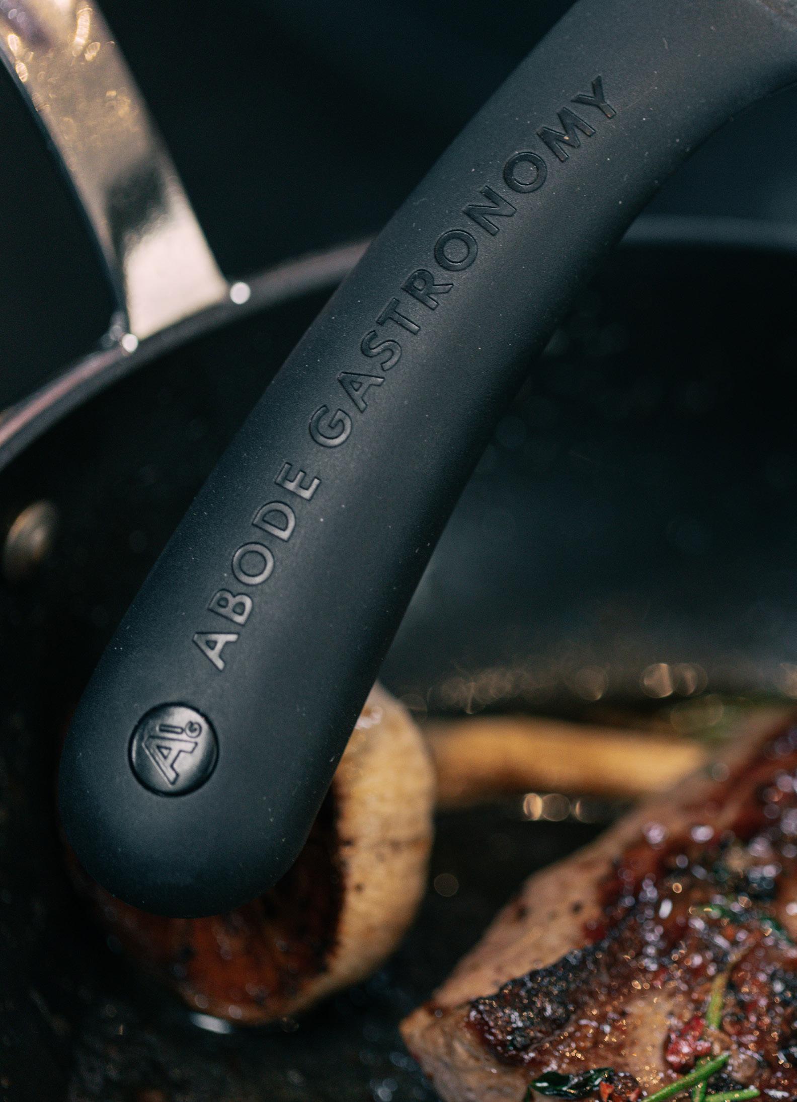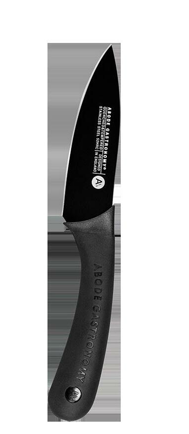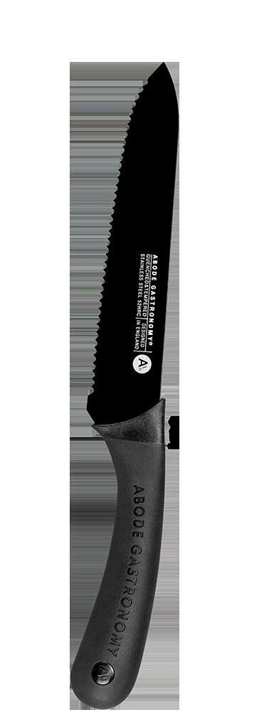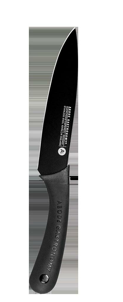 Abode’s knives have been designed alongside acclaimed chefs and approved for use in a professional kitchen. Oversized soft grip handles are made with recycled point consumer materials and offer a secure and confident grip. The taper ground blades have been developed to the ideal hardness for a long lasting edge and easy sharpening. High carbon stainless steel is coated in a a non-stick black finish for a sleek and modern look.