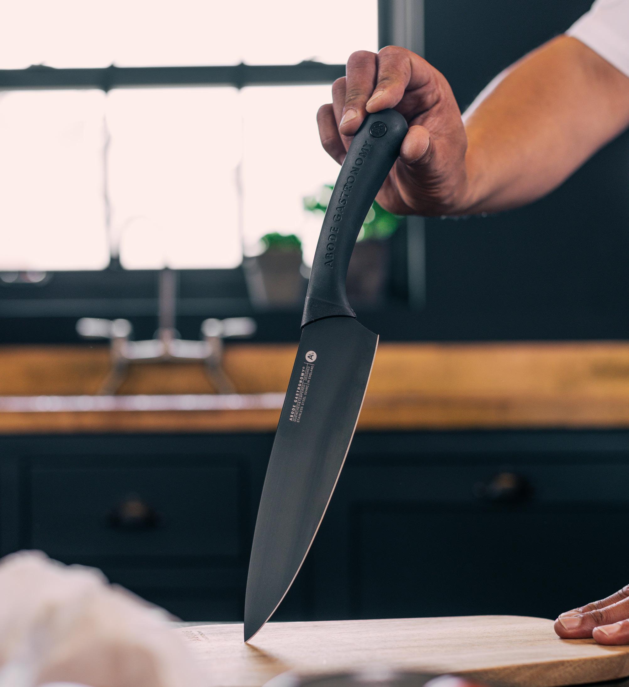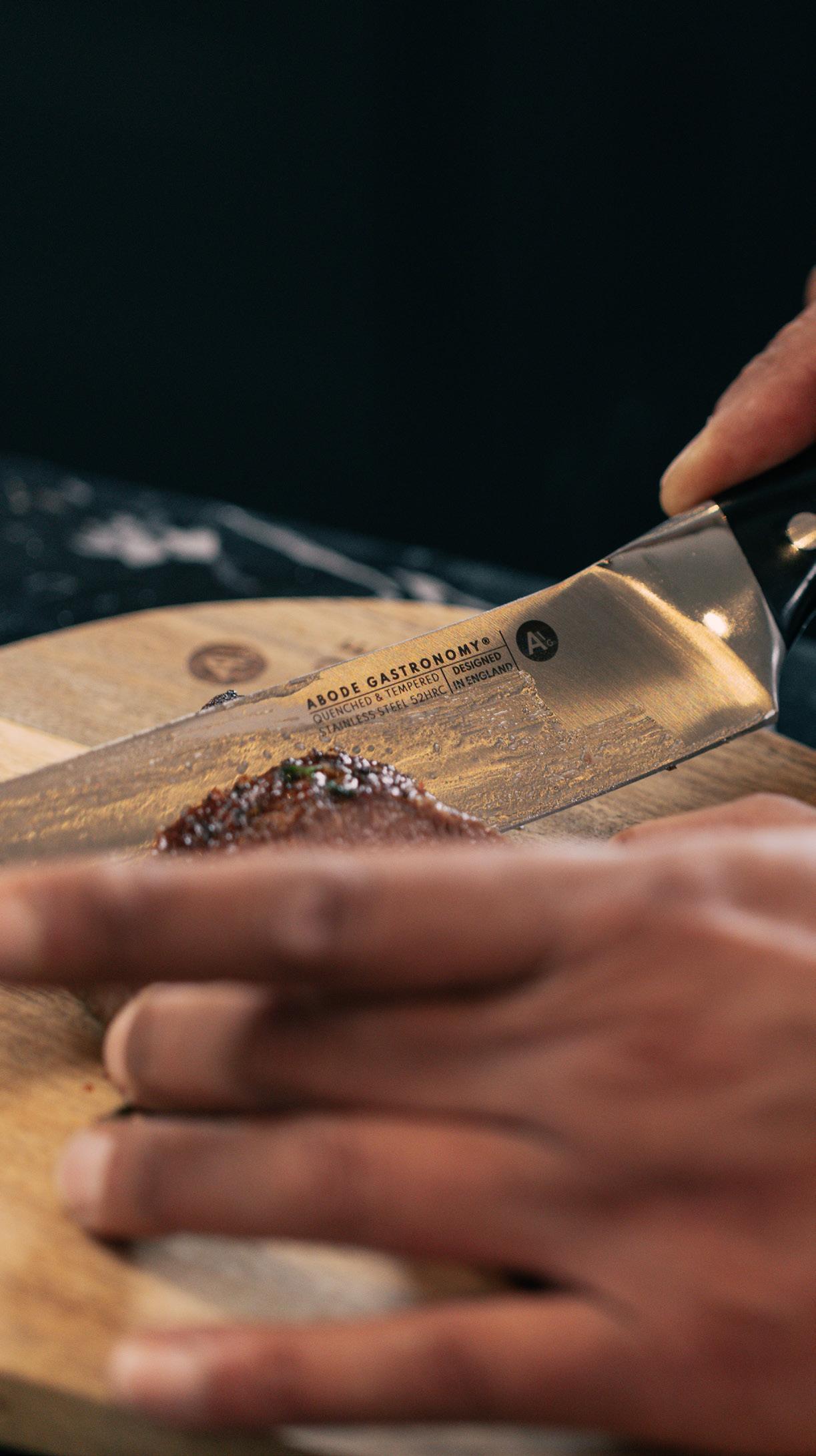 Abode’s premium knives have been designed alongside acclaimed chefs and approved for use in a professional kitchen Perfectly balanced weighted handles have a full tang and offer a secure and confident grip.