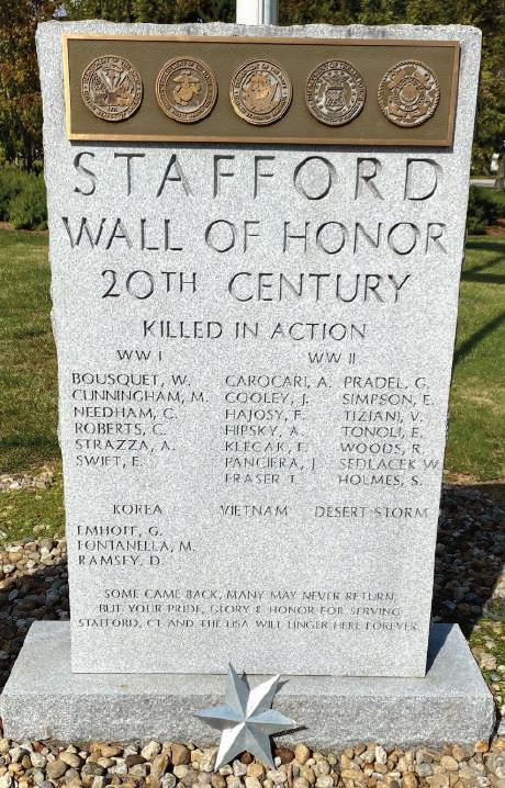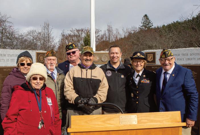 Stafford’s annual Veterans Day Ceremony and Wall of Honor Phase 4 Dedication took place Nov. 11 at Veterans Memorial Park on Olympic Circle. Community members, veterans, local officials and family representatives gathered to honor those who have served and to recognize the newest additions to the town’s Wall of Honor. The Ceremony and project was organized by the Veterans Advisory Committee (from left): Judith Titus, Arline Beapre, Robert Titus, Richard Schaffer, John Soucy, John Whetton, Elizabeth Dunay and Kevin Dalrymple. For more, see the Stafford First Selectman’s Corner, page 41. Another photo, page 12.