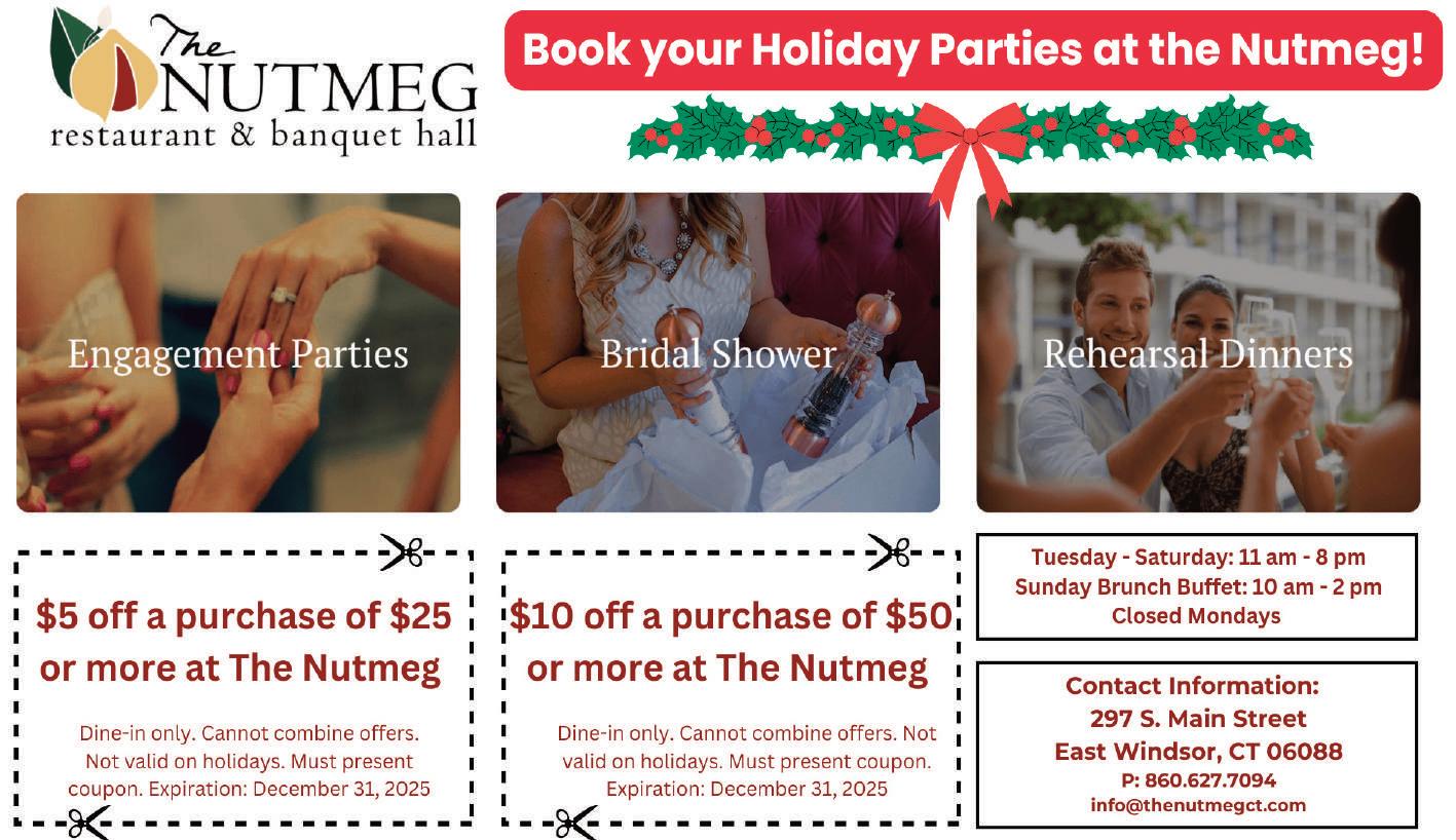 The Stafford Springs Congregational Church, 3 Main St. at the Rotary, presents its annual Holly Brunch & Browse from 9 a.m. to 1 p.m. on Dec. 6. There is parking across the street by the Town Hall. There is eat-in or take-out brunch for $10, French Toast Bake with sausage or Potato Bacon Cheese casserole, both served with a muffin, juice, and coffee. Or dine “continental” for $3.50, with juice, coffee and a muffin. Browse Christmas and attic treasure items, homemade cookies and candies, kitchen utensils, and raffle gifts and baskets. Bring return address labels to ease the burden of writing contact information. Proceeds benefit the community and local missions of the church. Call 860-550-2747 for details.