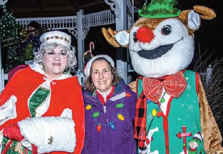 Mrs. Claus and Rudolph stand with Winterfest Committee Chair and Hall Memorial Library Director Sue Phillips.