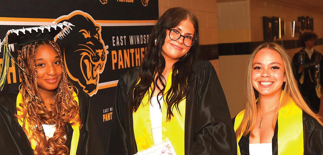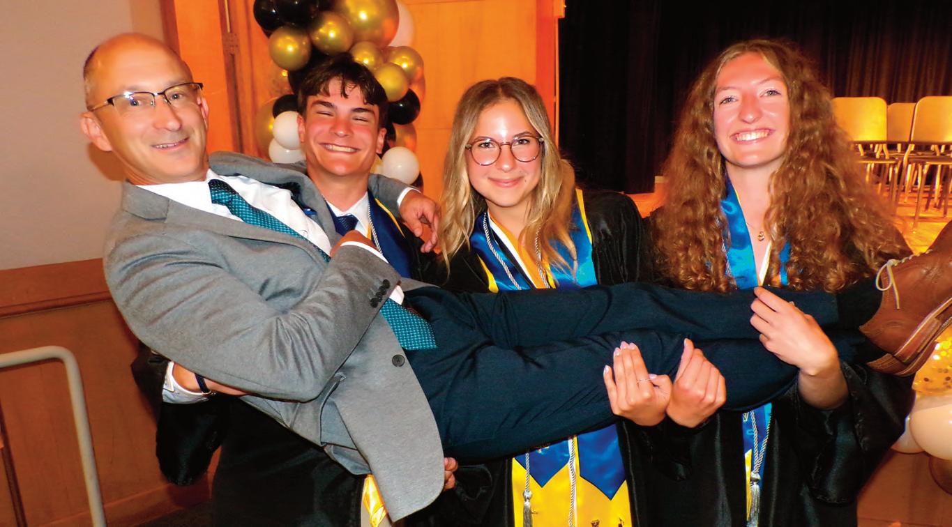 Above: Mr. Andrew Masters, Evan Witzke, Mariella Lukasik and Kristina Keyes give Mr. Andrew Mastersa lift during the East Windsor High School graduation ceremony.