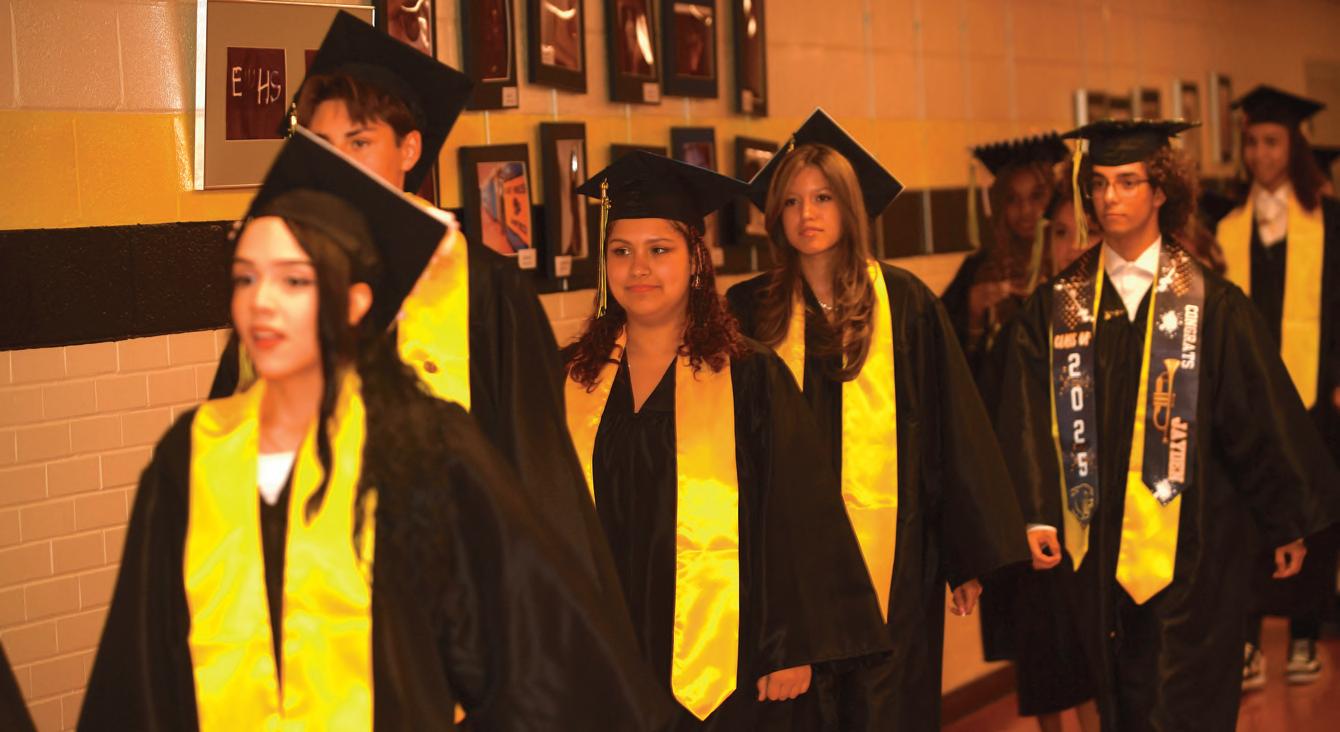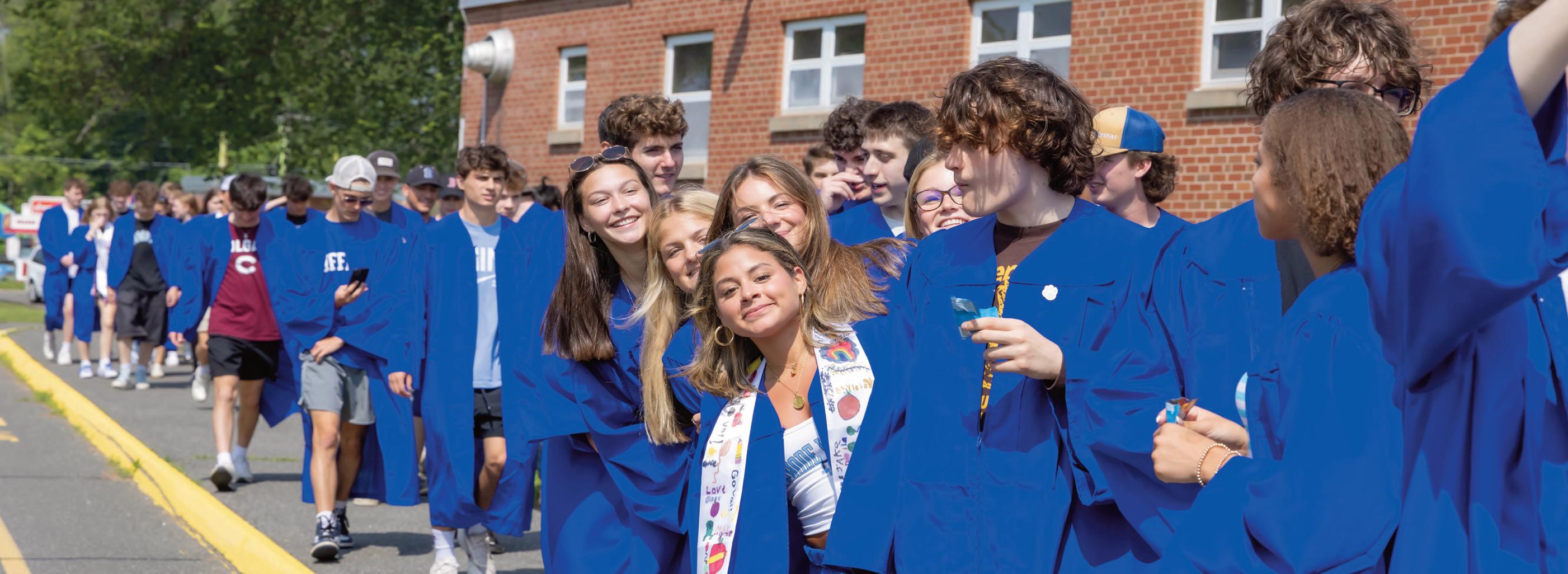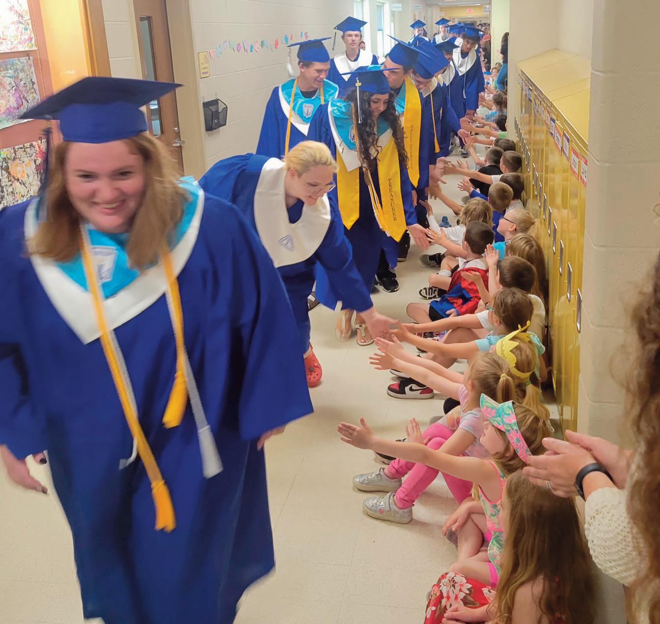 On June 11 the Stafford High School Class of 2025 made its traditional “Senior Walk” through all of the town schools. They are pictured here high-fiving in the first grade hallway of the Stafford Elementary School.