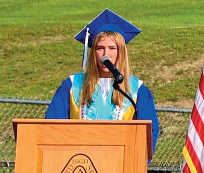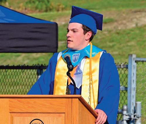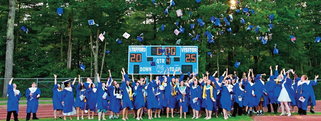 Stafford High Class President Jadyn Kun addresses the crowd at the commencement. Next page, clockwise from top: mortarboards go flying; guest speaker, Steve Glazier, NBC Connecticut StormTracker Team, SHS graduate, Class of 2004; Valedictorian Anna Fahey; Salutatorian, Jacob Bouchard.