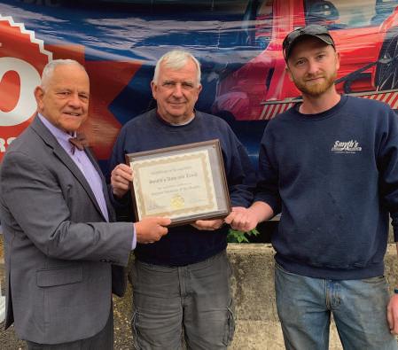 Left, as Connecticut honored its World War II veterans, representing Stafford were Edward Molitoris and Dorothy Roberts, both WWII veterans. Pictured: Mrs. Roberts and Bill Morrison. Below, Morrison and Emergency Management Director Sgt. Desso.