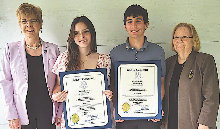 State Rep. Tami Zawistowski, R-East Granby, Suffield, Windsor Locks, left, and State Rep. Jane Garibay, D-Windsor, Windsor Locks, right, attended a ceremony honoring local students with DAR Good Citizen Awards. Rowena O’Sullivan of Suffield and Ben Palmer of Windsor Locks received the awards from the Sibbil Dwight Kent Chapter of the Daughters of the American Revolution. Both students were selected by their schools for this honor. Zawistowski and Garibay presented Connecticut General Assembly citations during the event.