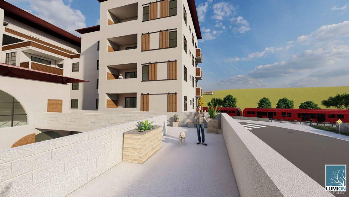 El Corazón is in San Ysidro California. San Ysidro is the last town just before the busiest border crossing from the United States to Mexico. This project is a community land trust in partnership with Casa Familiar. The goal of the project is to design one-bedroom to three-bedroom family homes. These are designed to be lived in for many years because in a community land trust, renters work towards ownership over time. This project has 14 one-bedroom units roughly 800 sq ft, 22 two-bedroom units roughly 900 sq ft, and 25 three-bedroom units roughly 1200 sq ft. This building is designed to be a modern twist on the traditional Spanish style home. The details of the building are painted corrugated metal, white stucco, black window casing, and dark walnut for exterior patios and doors. Starting from the top, we have created a new age terracotta roof with the use of corrugated metal painted to a terracotta color and then lifted two feet above the parapet to allow for the building and its rooftop mechanical systems to be nicely shaded. The idea behind this roof is to create a buffer of cool air above the building to decrease the building’s overall heat gain. There is also integrated solar on all the south pitched parts of the roof. Moving down the building, we have inset horizontal walnut panels encased in a six-inch frame of white stucco. For each main entrance to the building, there are large ten-foot by ten-foot arched entryways with large walnut doors. There are a total of six on the project. Next, there is an operable window shading system of walnut slabs on a barn door style rolling rail. These are only present on the south facing operable windows. Finally, we have the heart of the building, the community center. The community center consists of an indoor, two-level space used for community meetings and a computer lab center for a total of 1750 sq ft split into two levels and an 1800 sq ft partially enclosed courtyard.