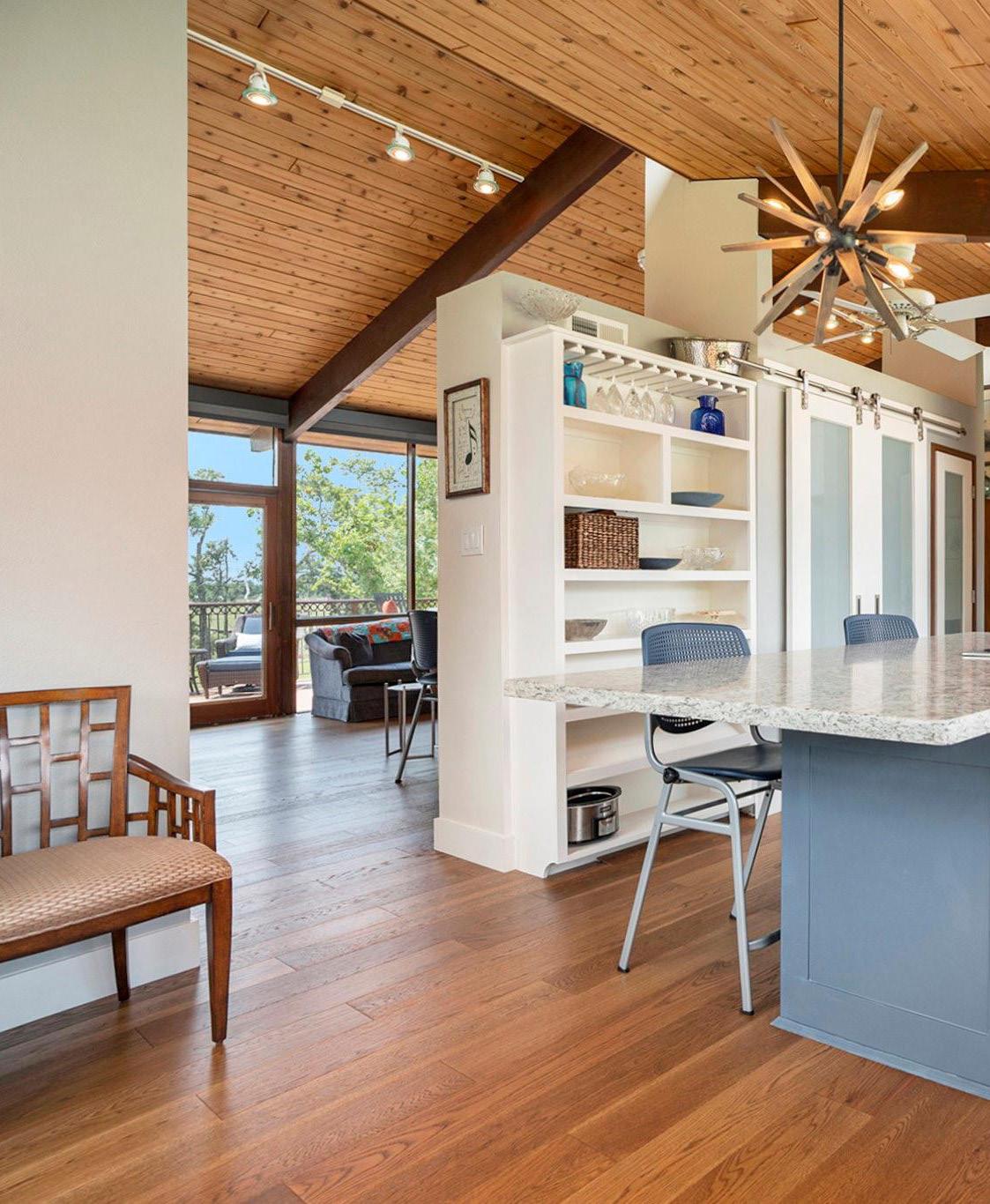 Custom-built single-story; luxuriously appointed home on the Jackrabbit course of Champions Golf Club with a private lake. The home features a single-level contemporary design, its exterior combines Lueder's limestone, Norman-sized brick, stucco, Western windows & doors, and a full metal roof. Inside, enjoy a Kohler generator, alarm system, Lutron & remotecontrolled lighting/thermostats, blinds, and insulated attic. Outdoors, you'll find the spacious patio, pool with a negative edge spa, firepit, outdoor kitchen, and beautiful landscaping. Indoors, marvel at Porcelanosa cabinetry & tile, 7” plank white oak engineered wood floors, walnut/black cabinetry, quartzite countertops/ backsplash, oversized waterfall island, Thermador appliances, steel/glass dry bar, and primary suite. Plus, home gym with sauna, additional guest rooms & baths, study, and powder bath with marble integrated sink. This luxurious home is truly one of a kind, with no detail spared.