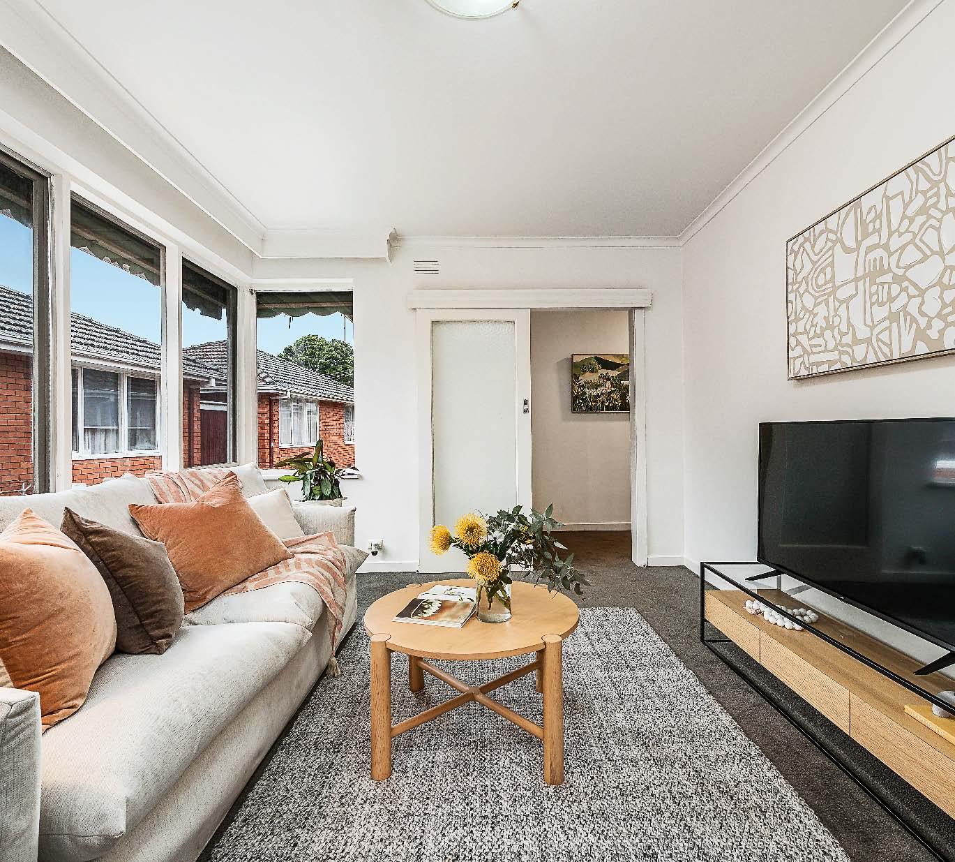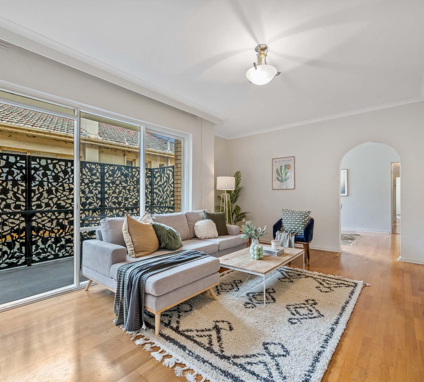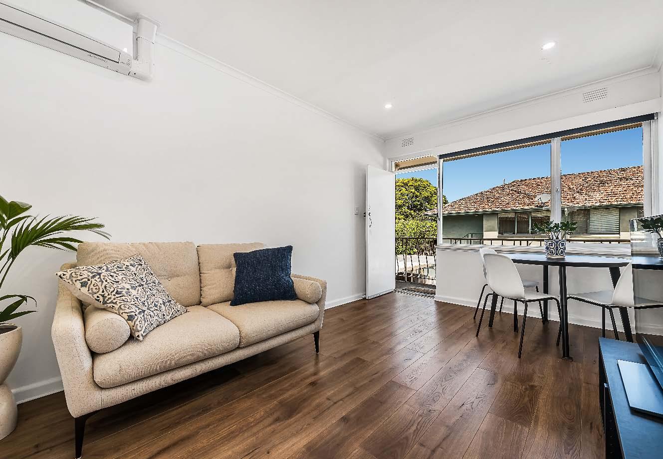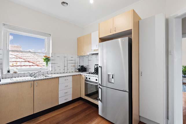 Nestled in a charming Art Deco boutique block of just four, in the heart of St Kilda East, this light filled top floor apartment defies expectations with its classic period charm, picture perfect facade & generous house like proportions. Whether you’re looking to enter the property market or for a future proof investment, this inviting period sanctuary on the corner of Young Street promises a fantastic opportunity & a vibrant lifestyle location to match. A sunny north-west facing front balcony greets you on arrival & introduces an entrance hall with polished timber floors & high ceilings that spills into a welcoming living/dining room with open