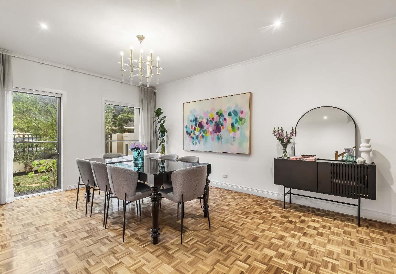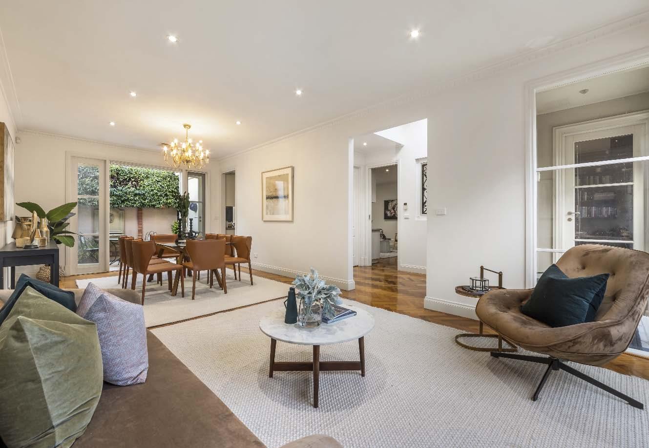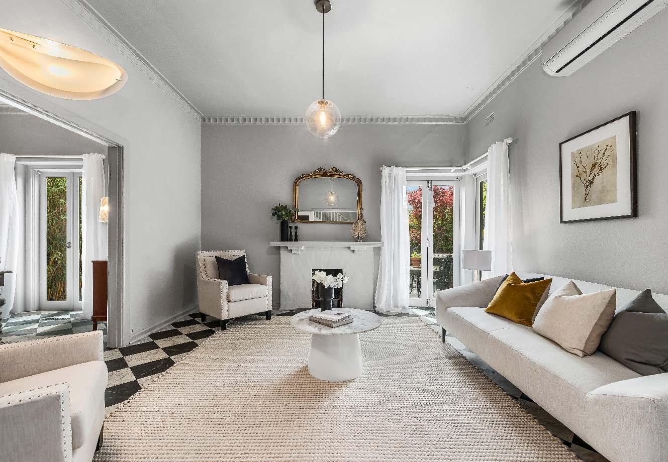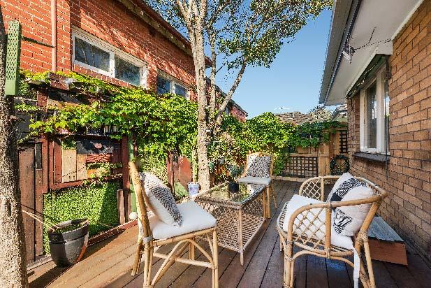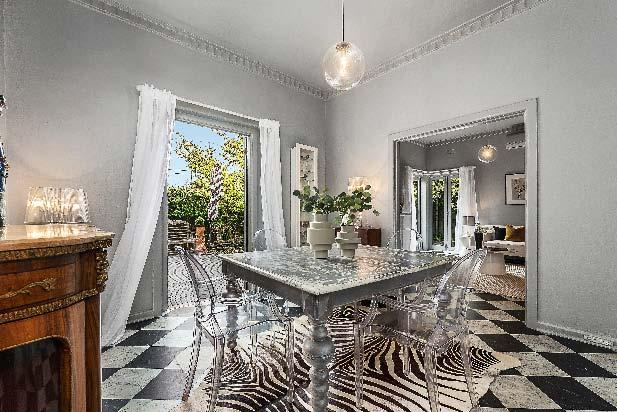 Set in a boutique block of five, this elegant solidbrick townhouse delivers period Deco features with Parisian-style updates in a tranquil garden setting. Boasting its own private entrance behind a secure intercom-monitored gate, the home’s expansive north-facing courtyard is instantly captivating, lined with stunning mature maple trees & multiple decked alfresco zones for sunlit outdoor entertaining. Inside, elegant features of checkerboard tiling & soaring ceilings adorned with original Deco mouldings run throughout. Off the impressive entrance, a spacious living with open fireplace & adjoining dining room both