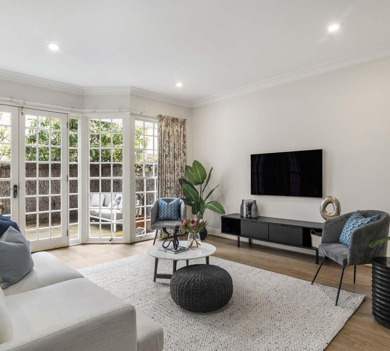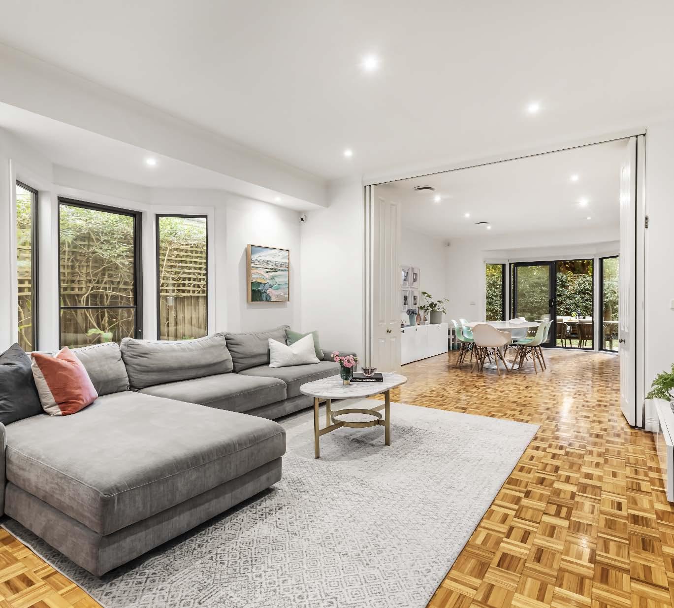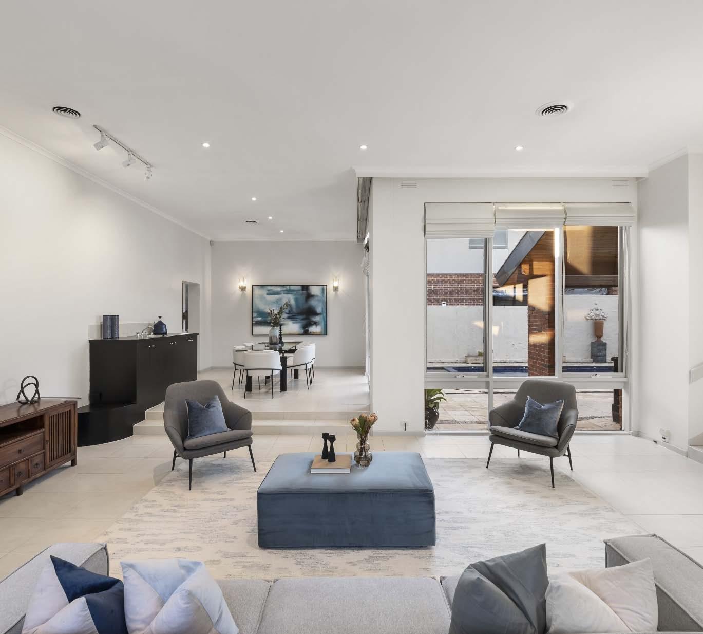 Set in a boutique block of five, this elegant solidbrick townhouse delivers period Deco features with Parisian-style updates in a tranquil garden setting. Boasting its own private entrance behind a secure intercom-monitored gate, the home’s expansive north-facing courtyard is instantly captivating, lined with stunning mature maple trees & multiple decked alfresco zones for sunlit outdoor entertaining. Inside, elegant features of checkerboard tiling & soaring ceilings adorned with original Deco mouldings run throughout. Off the impressive entrance, a spacious living with open fireplace & adjoining dining room both