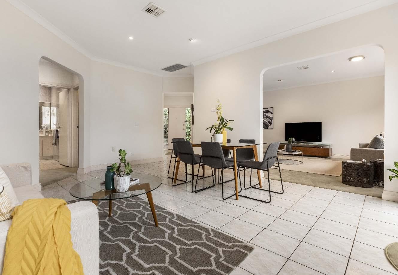 window looking out to a paved entertainer’s side courtyard with established garden surrounds. While a spacious, well appointed, stylishly updated stone kitchen with space for meals area table & a separate laundry with additional toilet, enjoys access to a large rear garden. Also featuring a main bedroom with built-in robes, two additional bedrooms & a sparkling central bathroom with bath, shower & separate toilet. Other features include central cooling & split system air con in the kitchen, off street parking for at least two cars with single carport, a rear storage shed & workshop space.