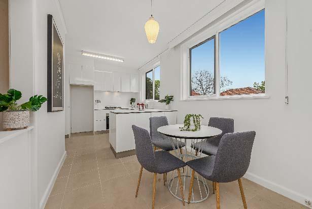 area that enjoys access to a balcony. Adding to the appeal, a modern well-appointed stone kitchen with stainless steel appliances & an abundance of soft close cabinetry overlooks a casual meals area. While a spacious main bedroom with built-in robes, a second bedroom with built-in robes & a stylishly updated central bathroom with original terrazzo marble flooring, bath, shower, laundry facilities & separate toilet, completes the accommodation. Additional features include a single lock up garage (on Title) behind auto front gates, split system heating/cooling throughout, ceiling fans & hallway storage.