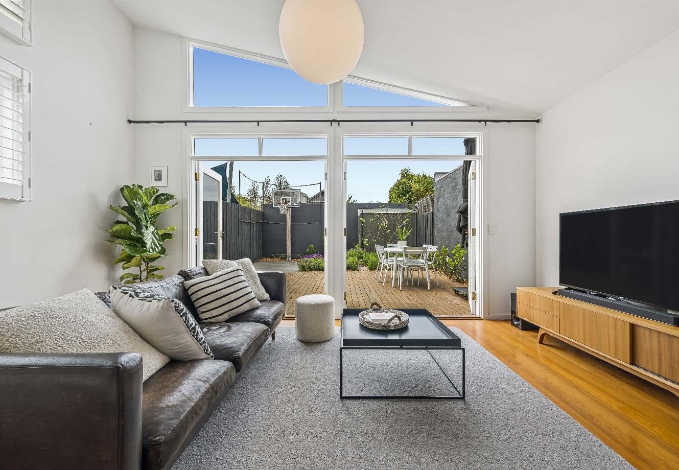 a beautiful pressed metal ceiling, ornamental fireplace, built-in robes & marble ensuite. The hallway culminates in the open plan light saturated living & dining zone with slanted soaring ceilings & clerestory windows further complemented by a well appointed modern kitchen with updated stainless steel appliances. This space extends outdoors to a good sized rear courtyard with expansive timber deck & garden surrounds, ideal for alfresco relaxing & entertaining. Other features include ducted heating, split system heating/cooling, rear storage shed & built-in basketball hoop.