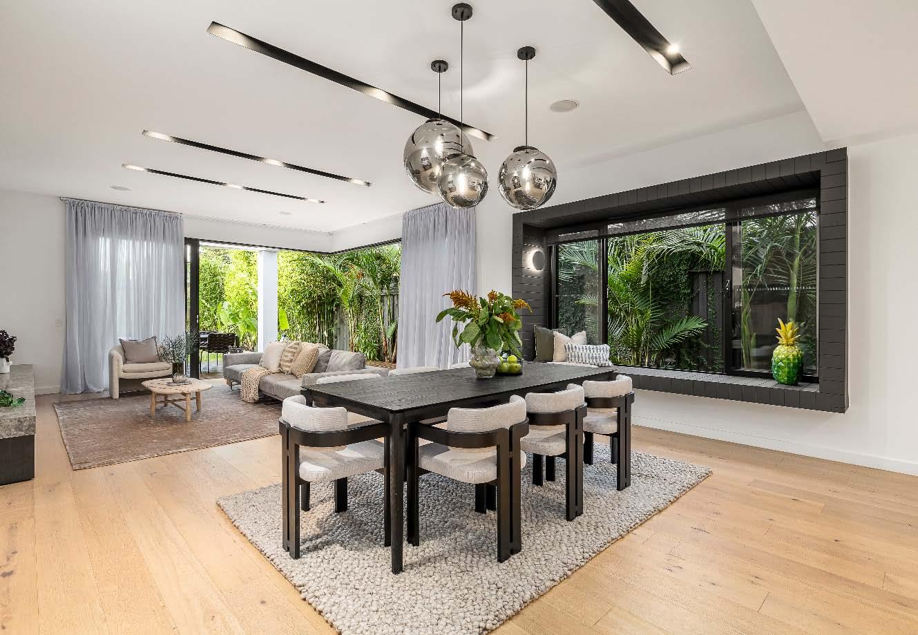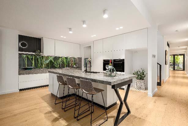 An Architect designed, light-filled haven ending in sweeping rooftop views, this fourbedroom town residence is destined to impress. Presented as new both indoors & out, a red-brick façade reveals an open-plan interior lined with engineered floorboards & soaring 3m ceilings. Blending seamlessly into the living, a gourmet island kitchen is equipped with Ilve professional appliances. Two sets of glass doors provide access to the home’s rear courtyard with a seating area & low-maintenance landscaping. A robed bedroom, laundry & bathroom complete the downstairs. Upstairs, a central landing serves as a home study