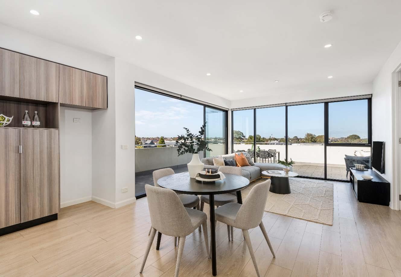 Stylish top-to-bottom updates, a sunlit aspect & serene leafy outlooks underpin this singlebedroom sanctuary in the heart of seaside St Kilda. Enjoying a prime top-floor position, the immaculate interior has been meticulously renovated by its current owner to include solidoak flooring, imported Spanish tiles & brand-new wardrobes. Filling the living & dining space with streams of natural light, large western windows frame a leafy treetop outlook, while capturing a glimpse of our city’s striking skyline. A renovated composite-stone kitchen includes a stainlesssteel oven, induction cooktop & both an integrated