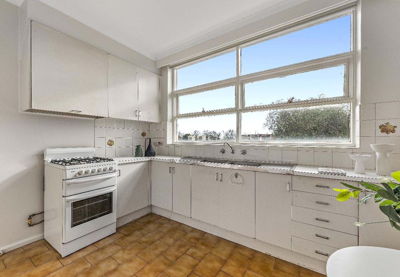 Perfectly positioned in a thriving enclave known for its promising rental returns, this spacious two-bedroom residence is primed for living or leasing while offering excellent scope for cosmetic renewal. Elevated on the first floor of a secure courtyard block, the freshly painted interior is lined with brand-new carpets & reveals a spacious north-facing living zone overlooking the block’s lush central garden. The functional kitchen is equipped for current use with a gas cooktop & oven & features a rear access door. Two bedrooms with built-in robes are serviced by a bathroom with adjoining separate toilet & laundry. Complete with