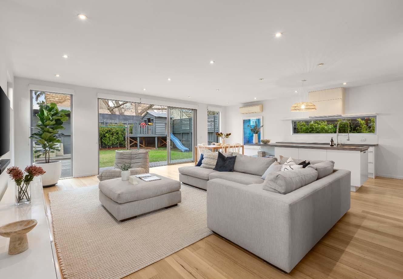is equipped with high-end Neff appliances & is complimented by a long galley-style butler’s pantry with laundry facilities & outdoor access. An outdoor entertainer’s oasis features a covered dining zone lined with low-maintenance composite decking, complete with a built-in gas BBQ suite with prep bench & fridge & retractable sides to create a fully enclosed outdoor room. Surrounding the deck: lush garden space & solar-heated pool/ spa hybrid. Generous storage throughout, offstreet parking behind lock-up gates & climate control of hydronic heating & central cooling complete this artfully renovated family home.