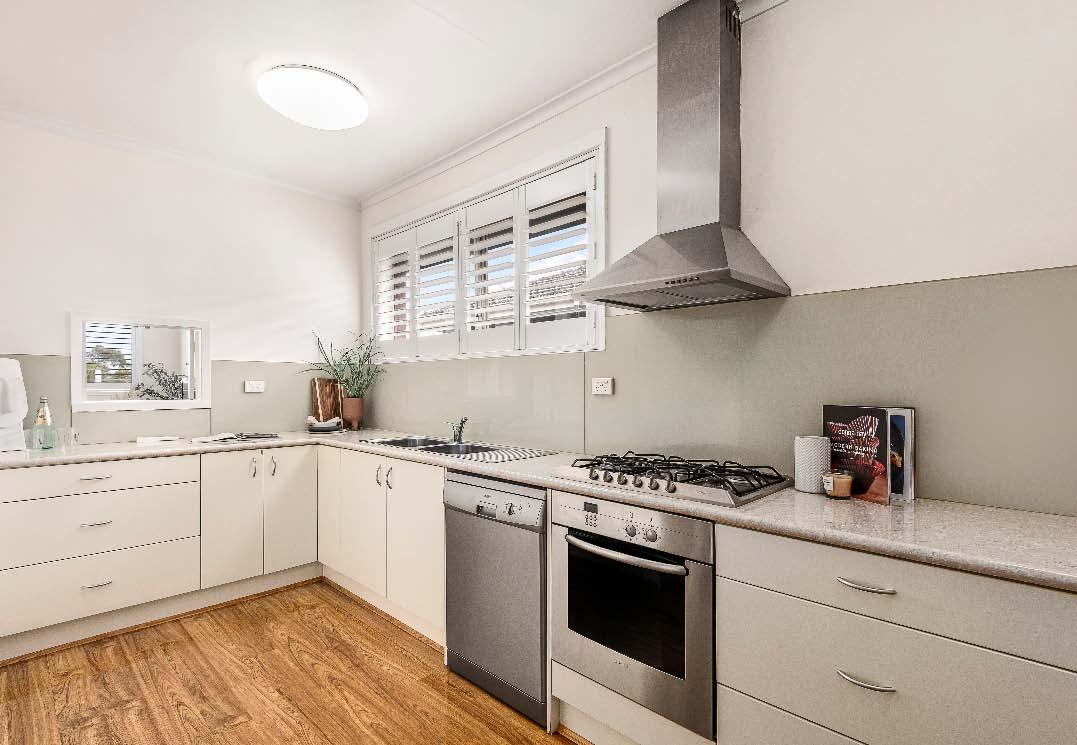 outlook, while the full-size kitchen impresses with its gas cooktop, dishwasher, Euro laundry & generous storage. Both bedrooms are generously proportioned & fitted with built-in robes, doubleglazed sliding doors & electric blackout blinds, while the stylish bathroom showcases quality finishes. Additional features include a secure lock-up garage with bonus storage space, efficient split system heating & cooling & the ease of modern, low-maintenance living.