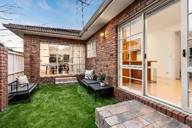 newly renovated kitchen & bathroom. The flexible flowing floorplan with gorgeous garden outlooks from almost every room delivers a spacious living room, brand new stone-topped kitchen with stainless steel appliances, access to a private north-facing courtyard & dedicated dining. While two bedrooms are serviced by a bathroom with laundry facilities & a separate toilet. Both bedrooms also open to a versatile sunroom with garden views – ideal as a study, home office or sitting room. Additional features include ducted heating, shared garden surrounds & a single garage accessed via a laneway off Glen Eira Road.
