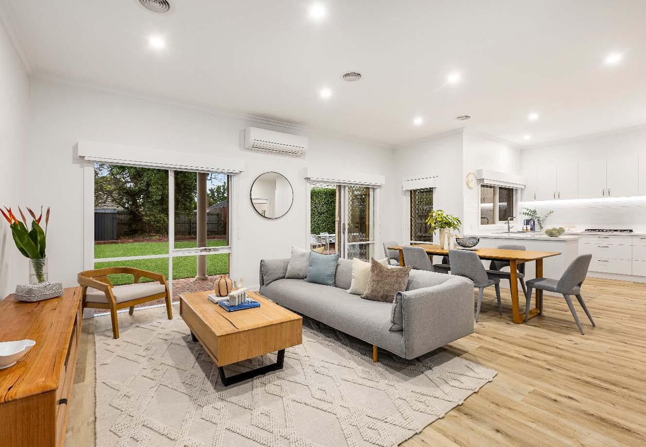by a walk-in wardrobe & an up-to-the-minute fully renovated ensuite with today’s contemporary colours, fittings & fixtures. Two more bedrooms with built-in wardrobes share a classic style, sky lit family bathroom with a shower-over-bath. With a secure entry, laundry, powder room, timber floors, fans, split systems & a garage, you’re a short walk to every kind of lifestyle amenity this suburb is renowned for with three major parks, buses, GESAC, in the Bentleigh Secondary College & Coatesville Primary school zones, a few minutes walk to St. Peters Primary & on the cusp of the best of numerous Centre road shopping villages.