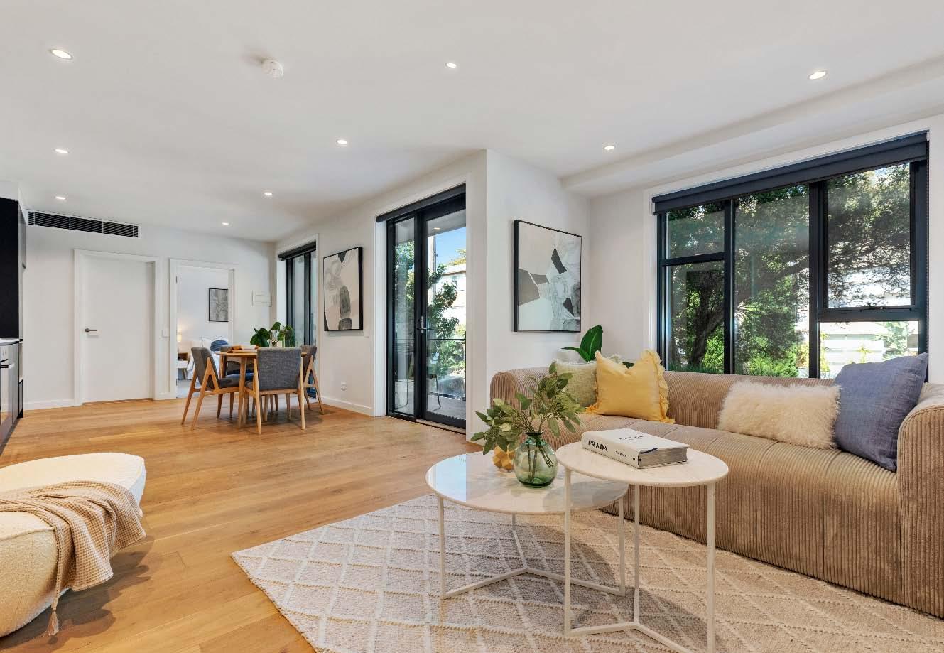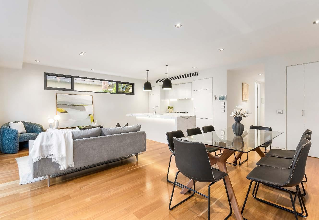 In a stunning brand new architecturally designed block of just four residences, discover an exclusive inner-city sanctuary with refined exterior & modern surroundings. Unique lighting guides you into a home that seamlessly blends cuttingedge style with urban flair. Elegantly presented, the interior boasts soaring ceilings & engineered oak floorboards that frame a spacious open-plan living & dining, complete with built-in joinery & a marble banquette. Conveniently the main bedroom is located on the ground level featuring built-in wardrobes, along with an ensuite & your own private courtyard through sliding doors. The