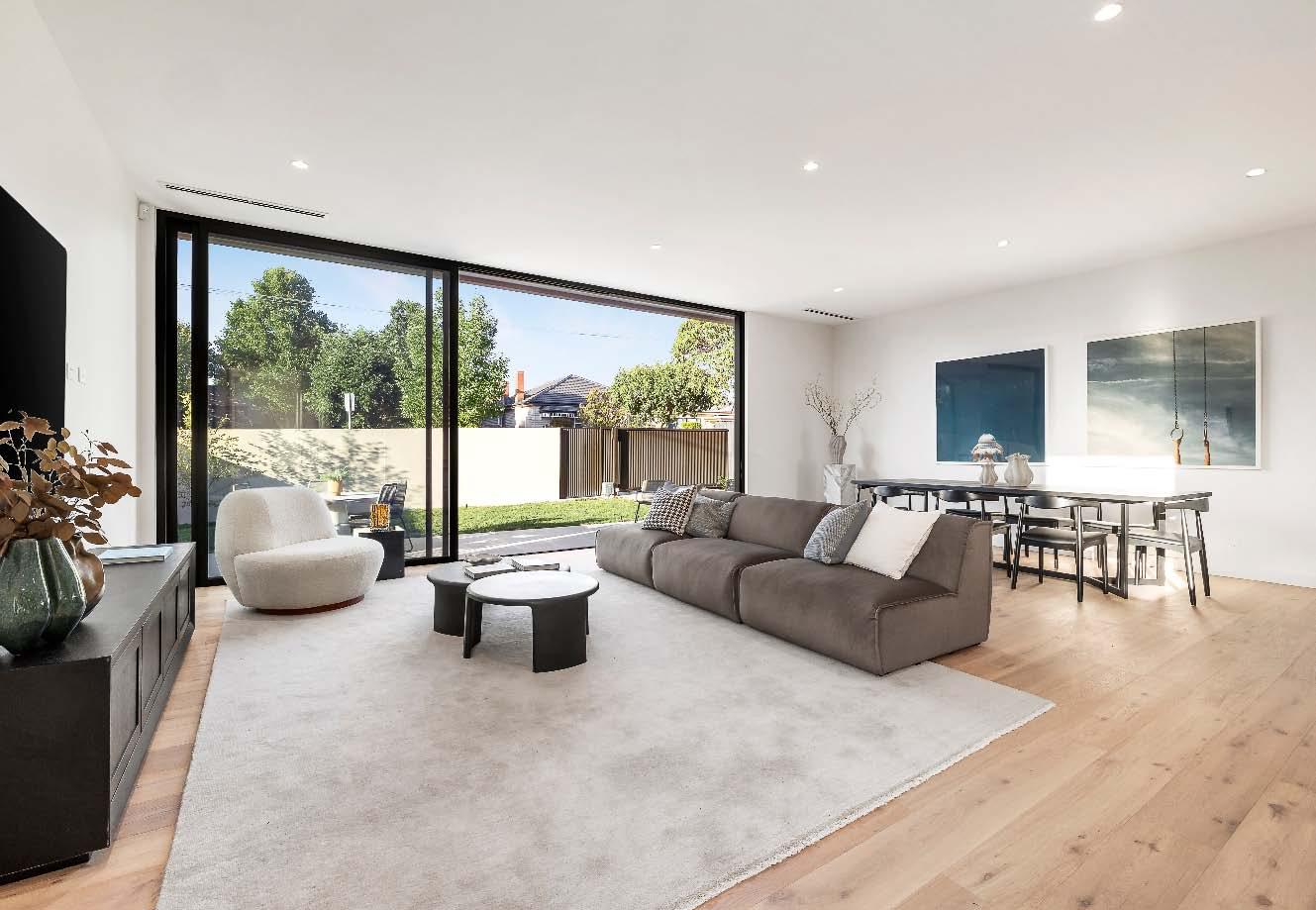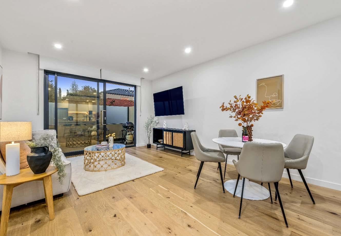 A stunning statement of style, this brand new Justin Architecture designed town residence, a picture of perfection on a prime corner block, showcases a striking façade as well as exemplary finishes & luxury across two expansive levels. As you step inside, wide pale oak flooring & high ceilings welcome you & flow right through to the heart of the home - an open plan living & dining bathed in northern sunlight. Here, large full height stacker doors connect the indoors & outdoors with an alfresco entertaining area & wrap around garden. Adding to the allure, a gourmet kitchen entices with marble benchtops & a suite of high