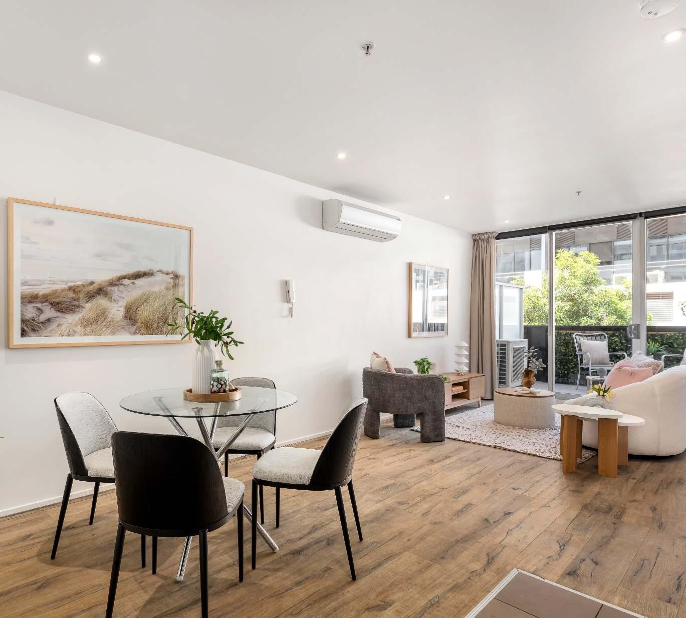 Perfectly positioned in the prestigious “Ever” apartment complex, this light filled, elegantly appointed contemporary apartment provides everything needed for a refined lifestyle. Ideal as a secure, low-maintenance residence for young professionals entering the market or as a prime investment for astute buyers looking to expand their portfolio. This thoughtfully designed, nearnew apartment is a standout. Engineered timber floors extend from the entrance into a bright, open-plan living & dining area, complemented by a sleek stone kitchen featuring European stainless-steel appliances (including an integrated