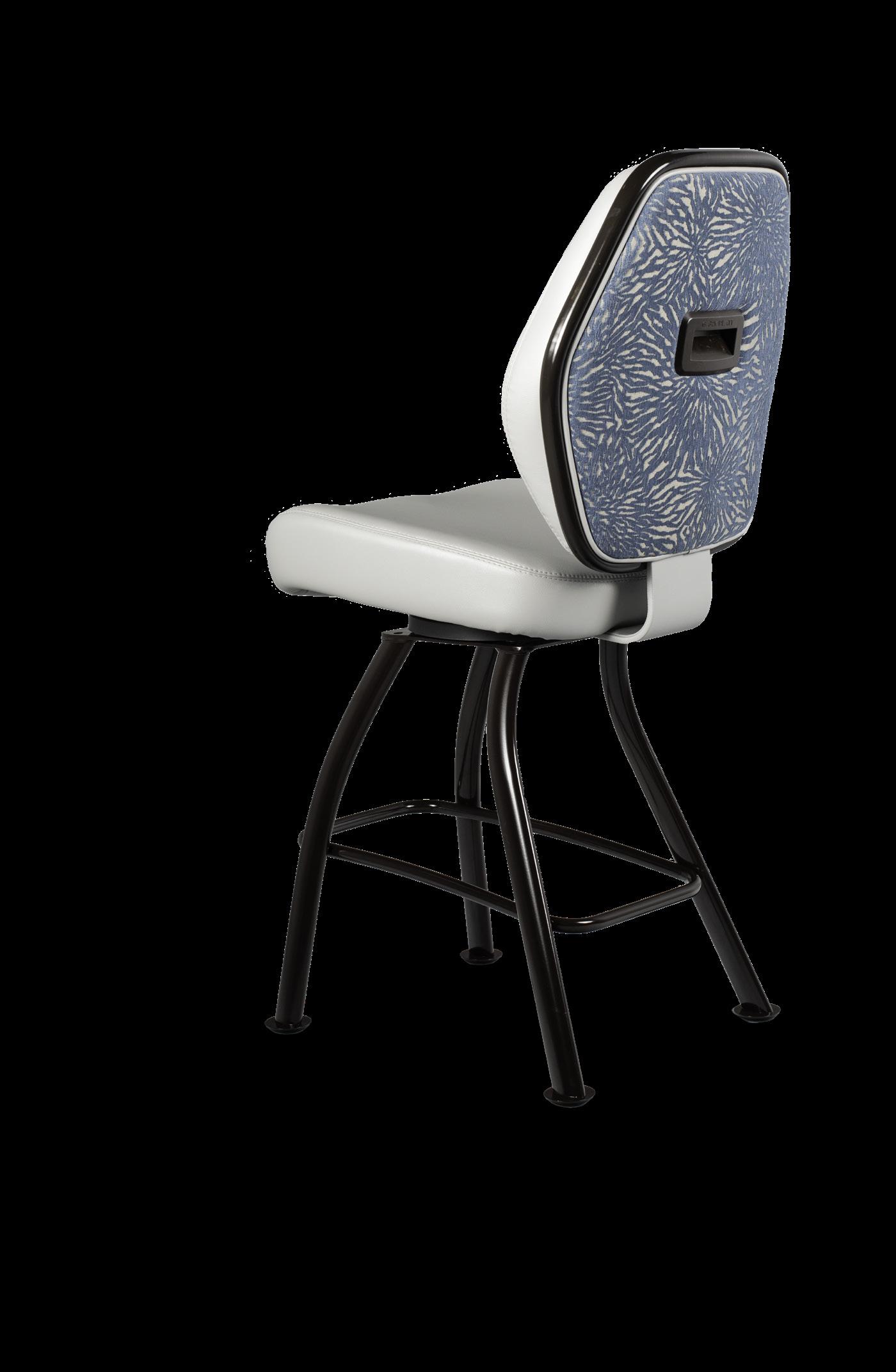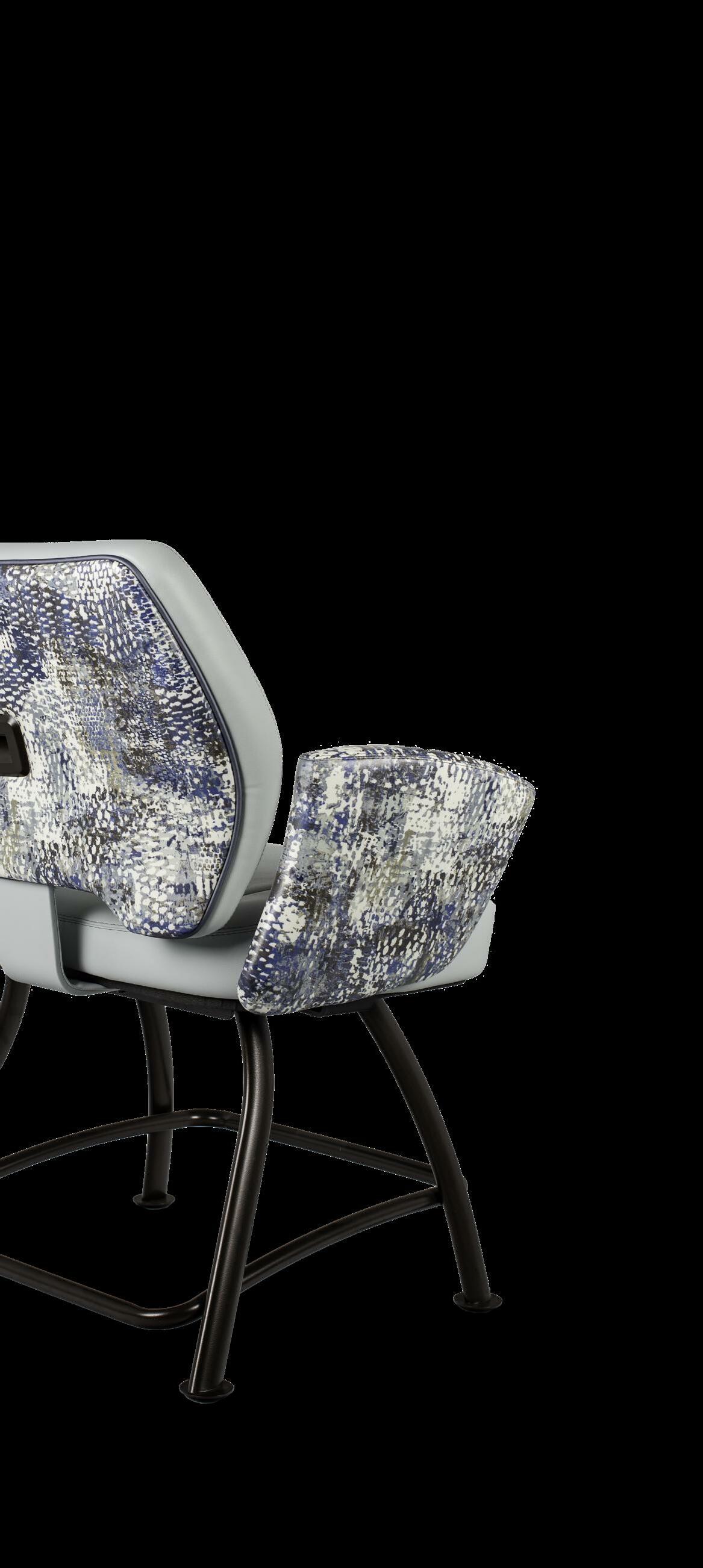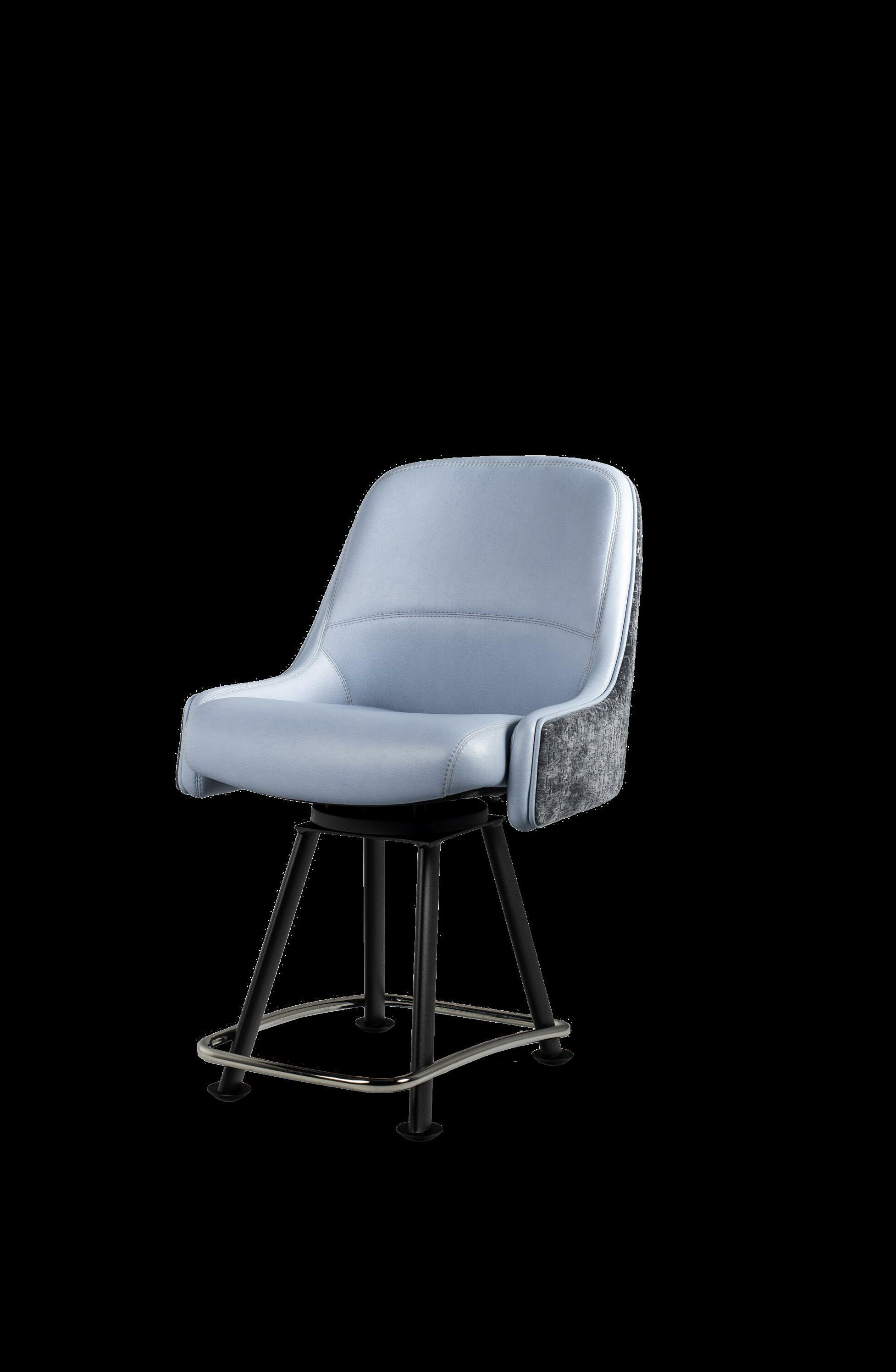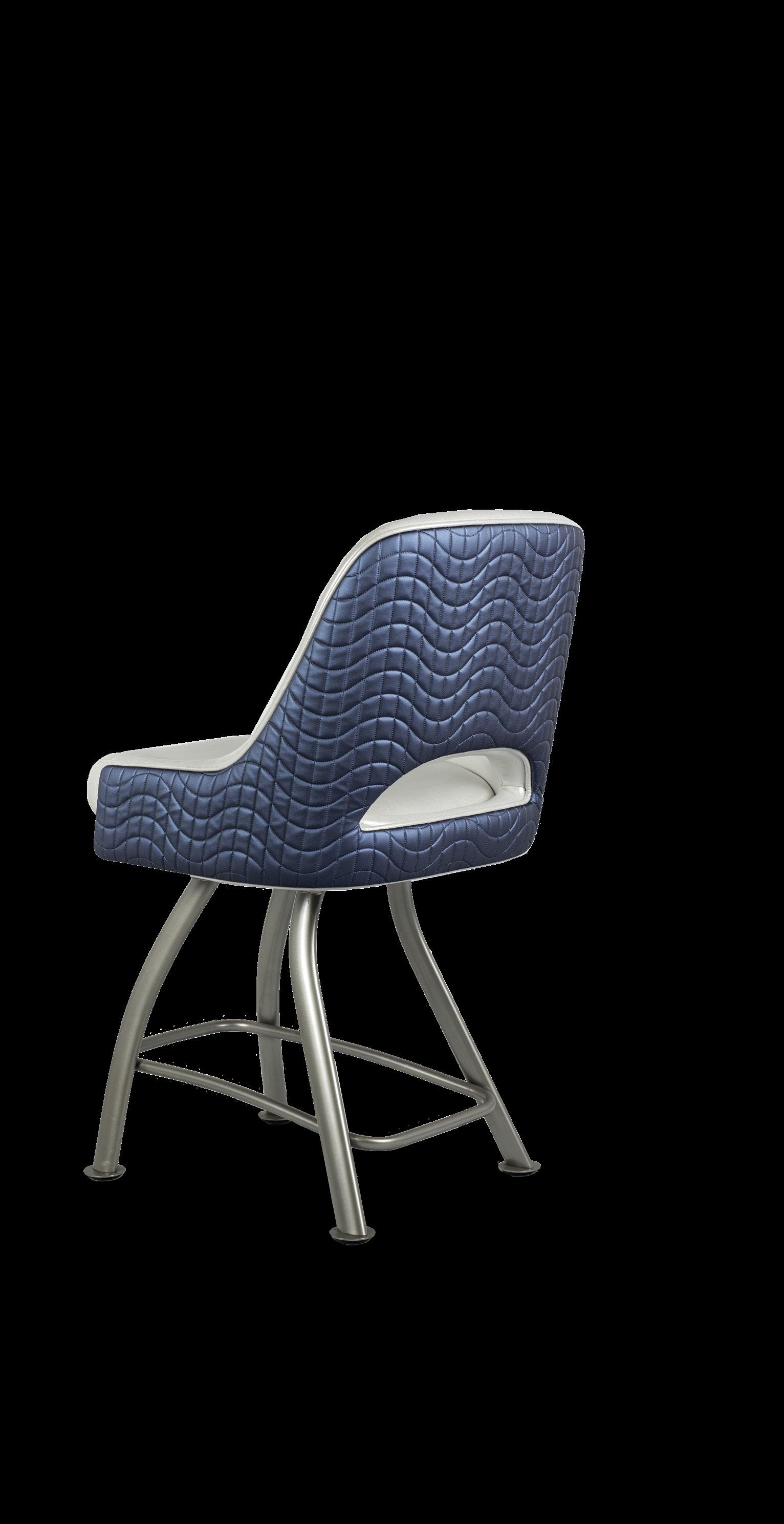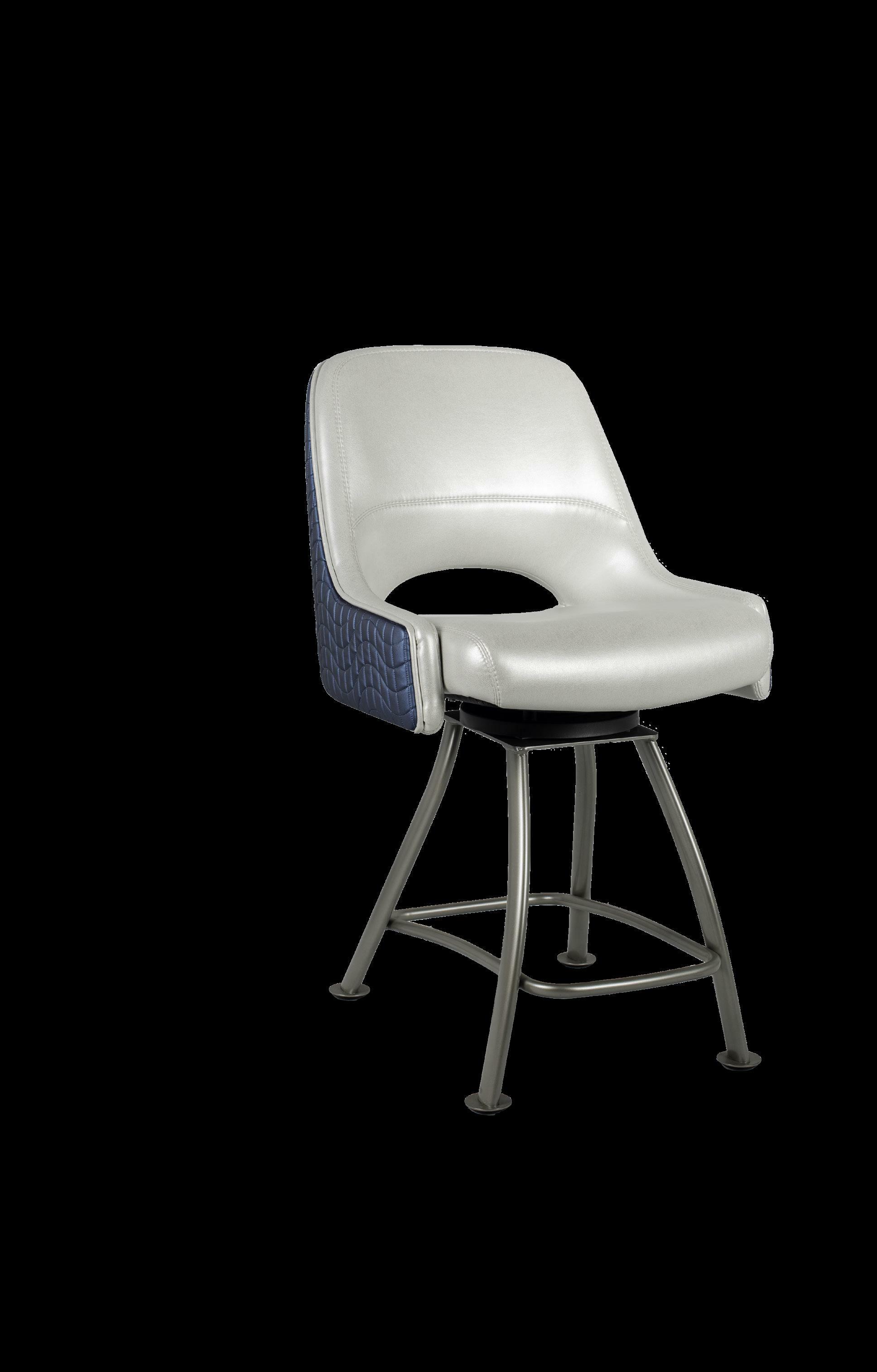Royale27 Style: Monaco Royale Seat Width: 21” Seat Height: 22” Base: Fixed Pedestal w/ Curved Spoke Footrest Inside Back and Seat Upholstery: Ultrafabrics Ultraleather Fusion Shimmer Frost Outside Back Upholstery: Swavelle Deimos Midnight Upgrades: Insert Handle Monaco Specifications
