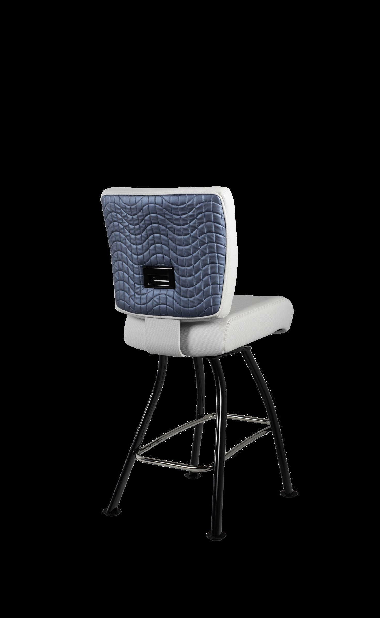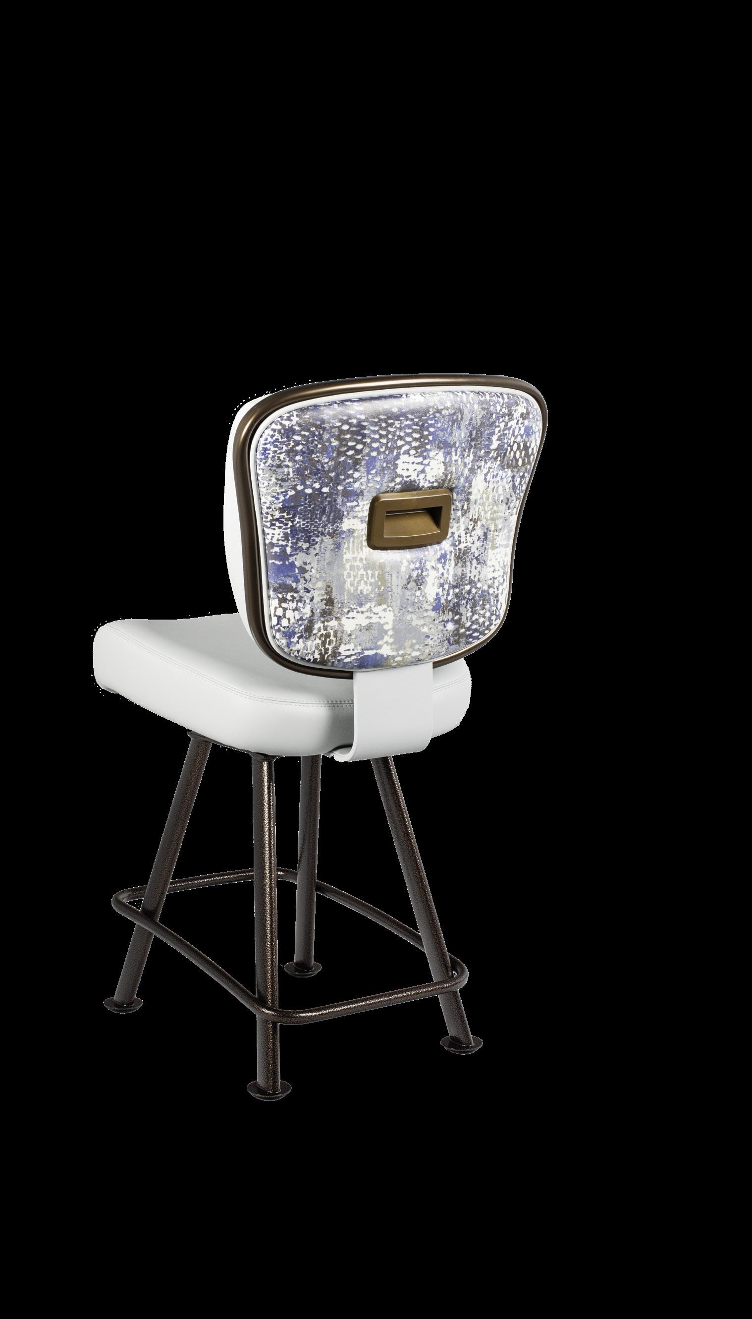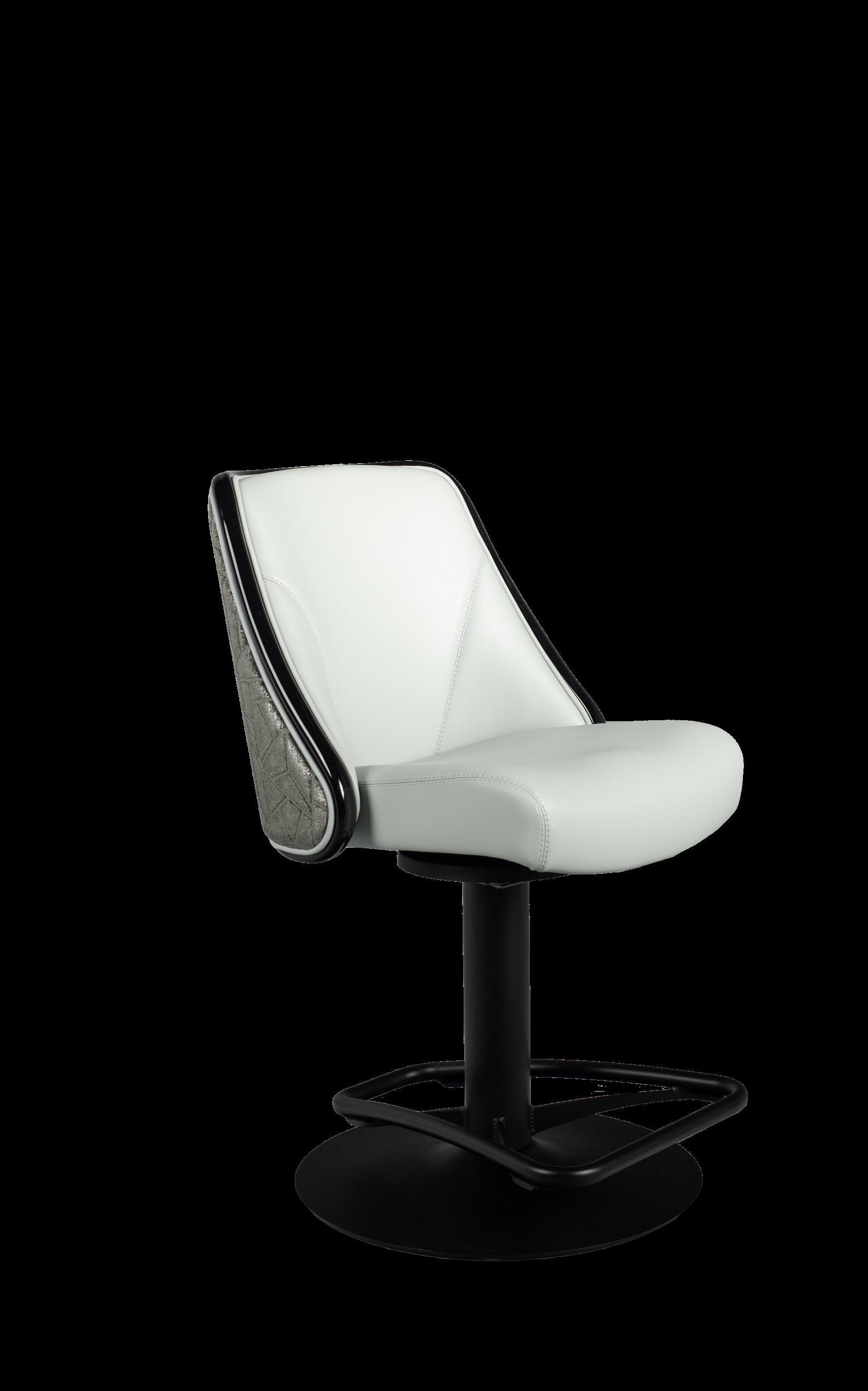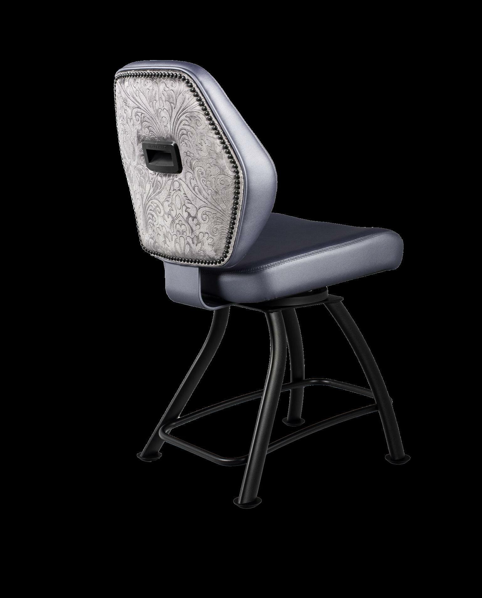 Royale27 Style: Monaco Royale Seat Width: 21” Seat Height: 22” Base: Fixed Pedestal w/ Curved Spoke Footrest Inside Back and Seat Upholstery: Ultrafabrics Ultraleather Fusion Shimmer Frost Outside Back Upholstery: Swavelle Deimos Midnight Upgrades: Insert Handle Monaco Specifications