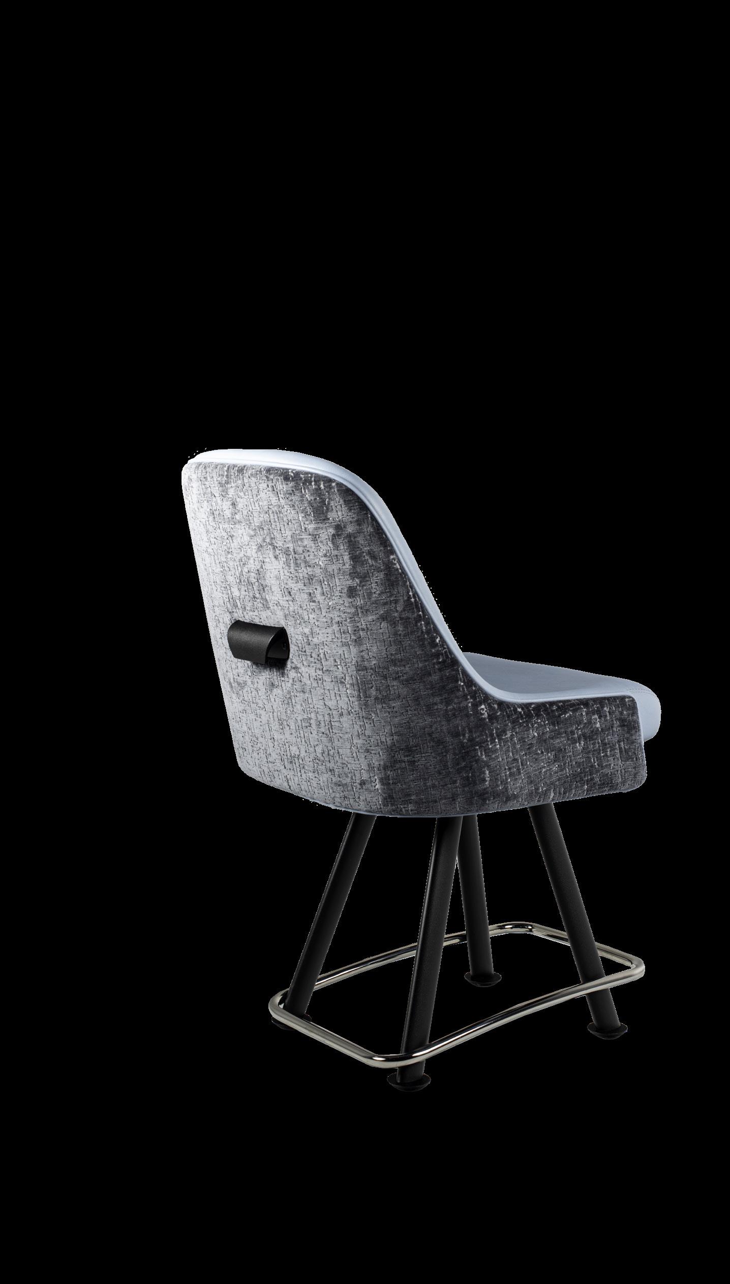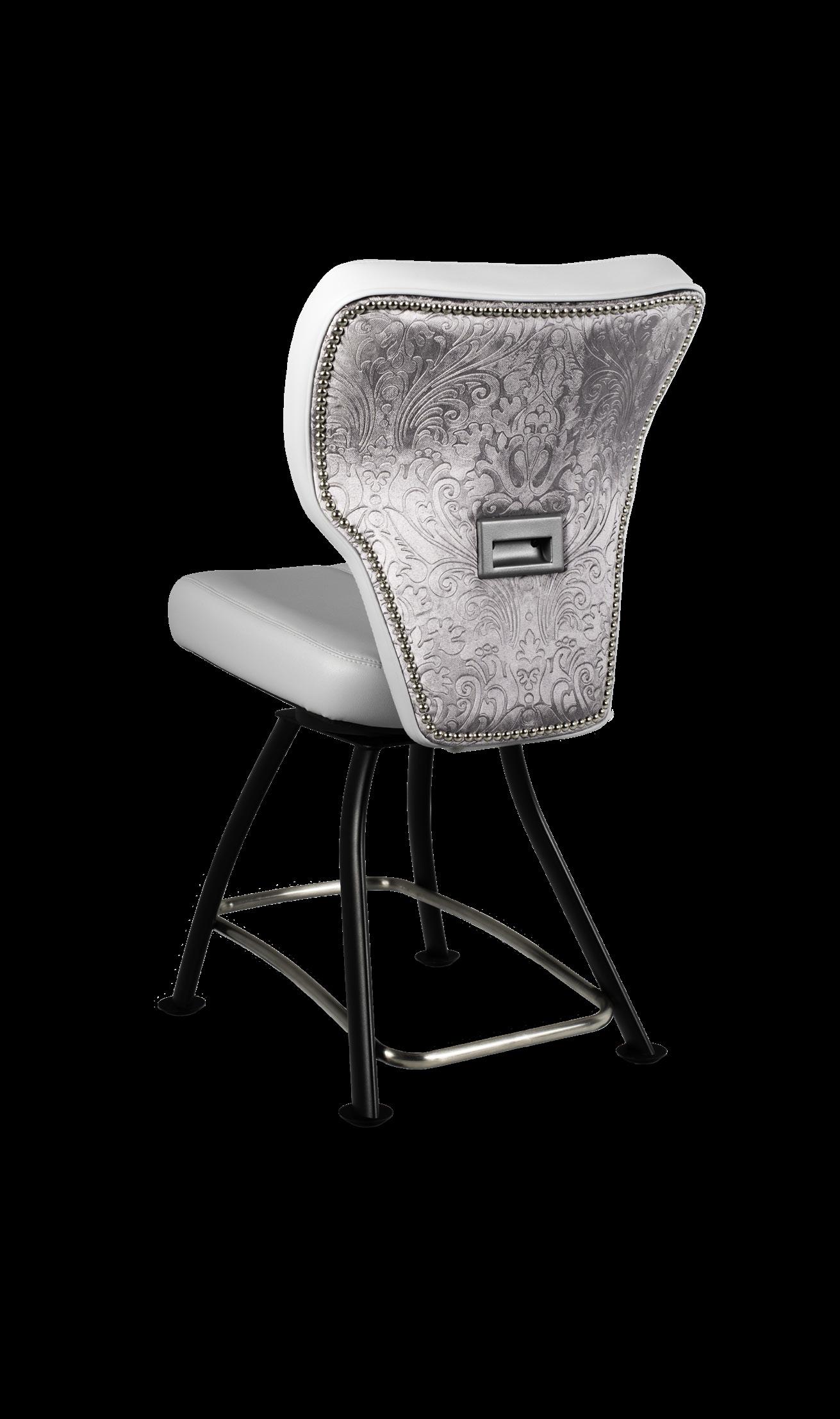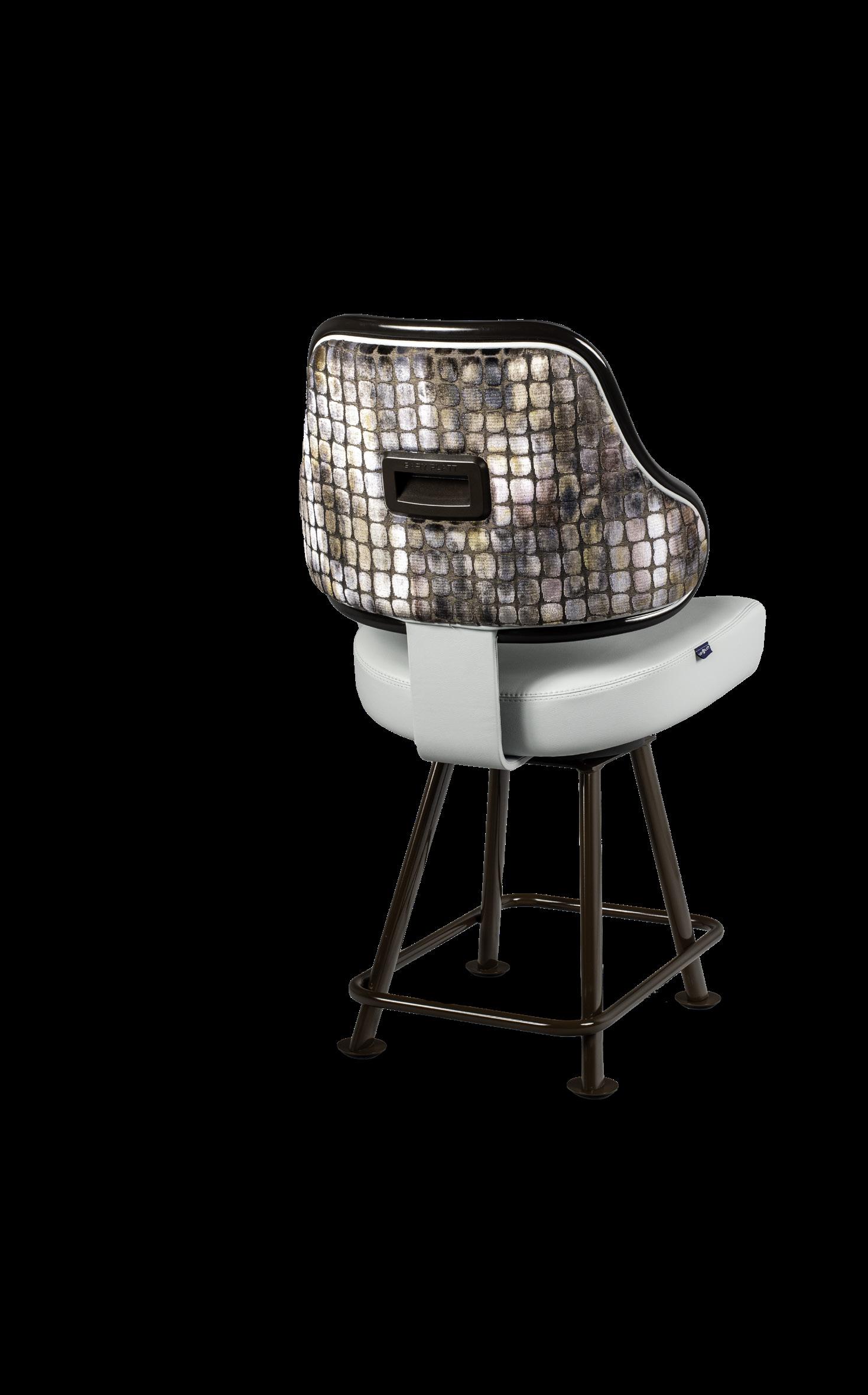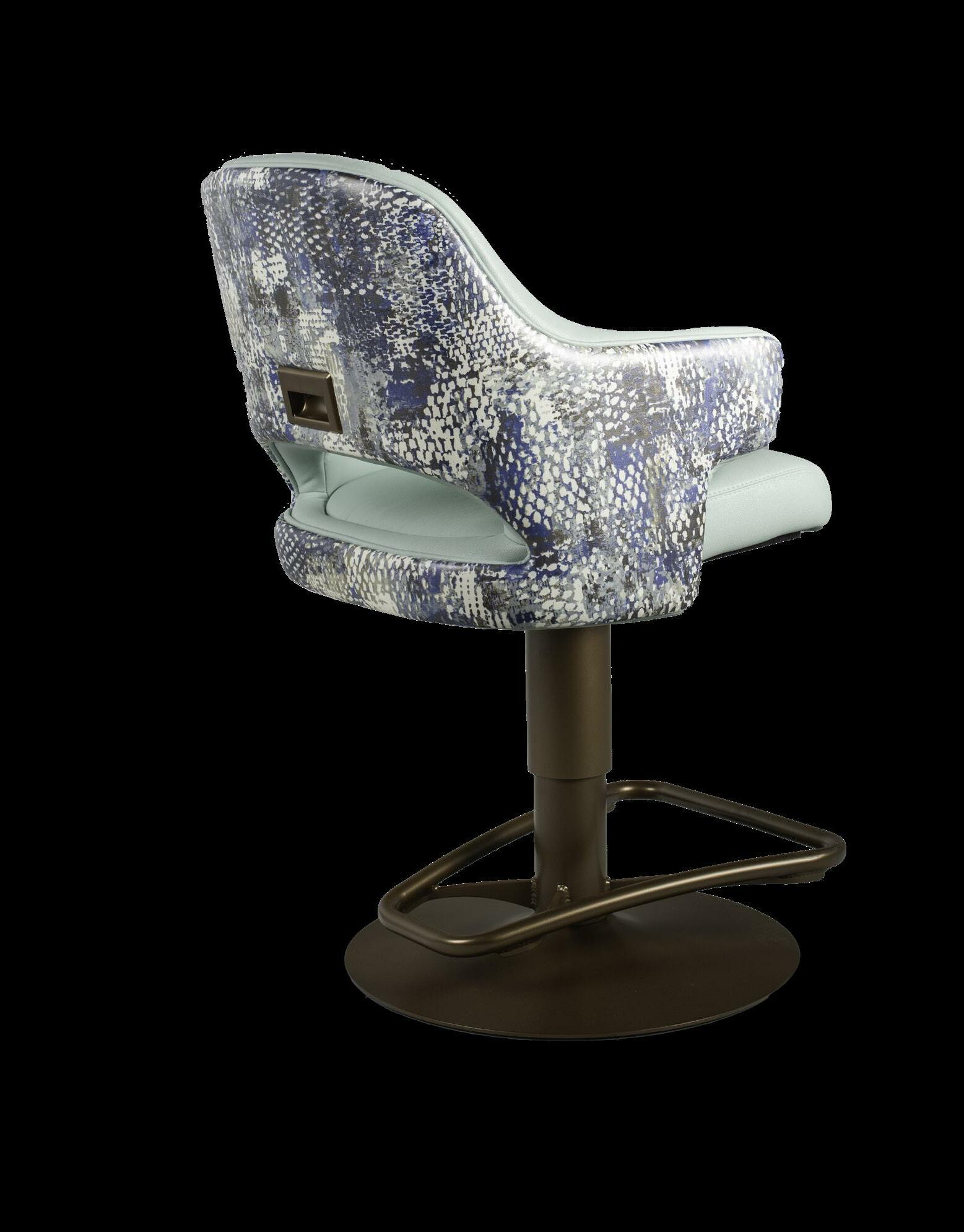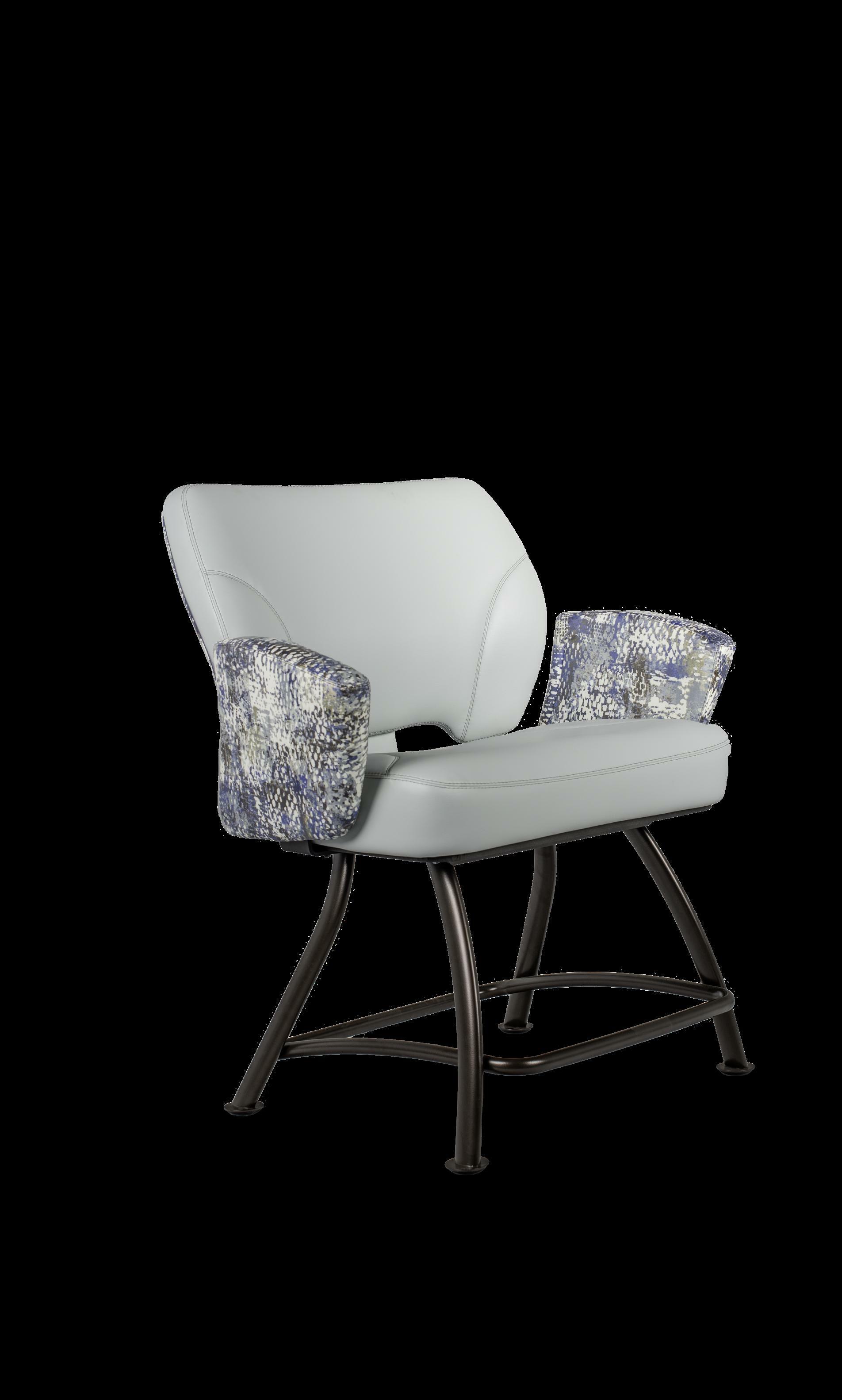 Royale27 Style: Monaco Royale Seat Width: 21” Seat Height: 22” Base: Fixed Pedestal w/ Curved Spoke Footrest Inside Back and Seat Upholstery: Ultrafabrics Ultraleather Fusion Shimmer Frost Outside Back Upholstery: Swavelle Deimos Midnight Upgrades: Insert Handle Monaco Specifications