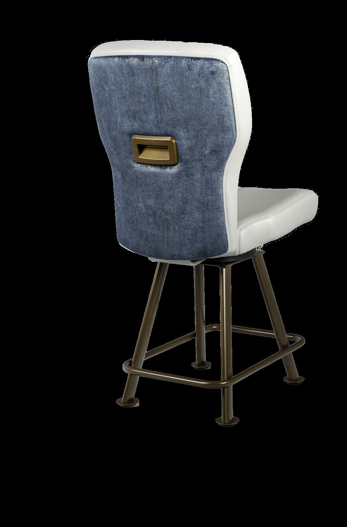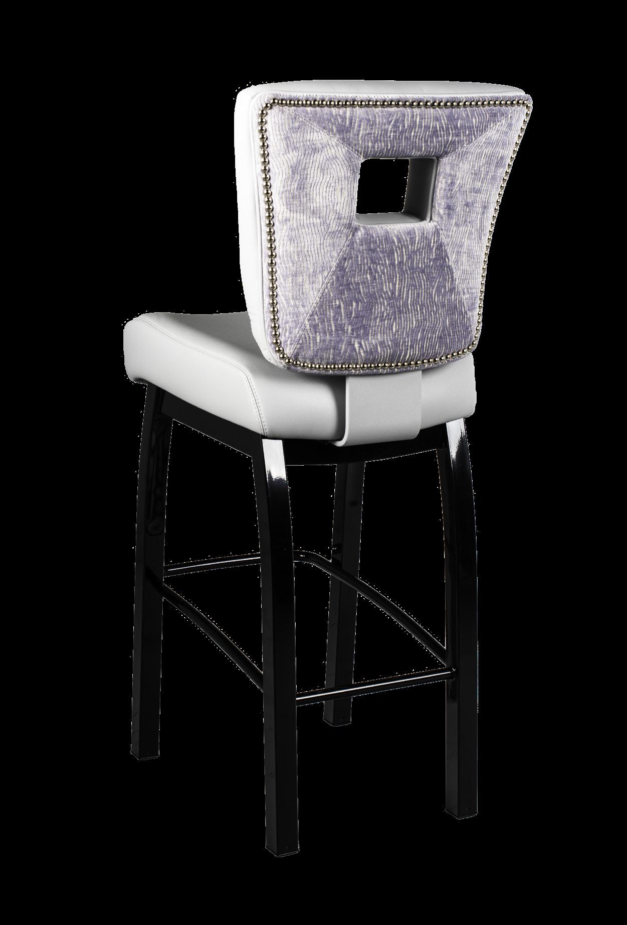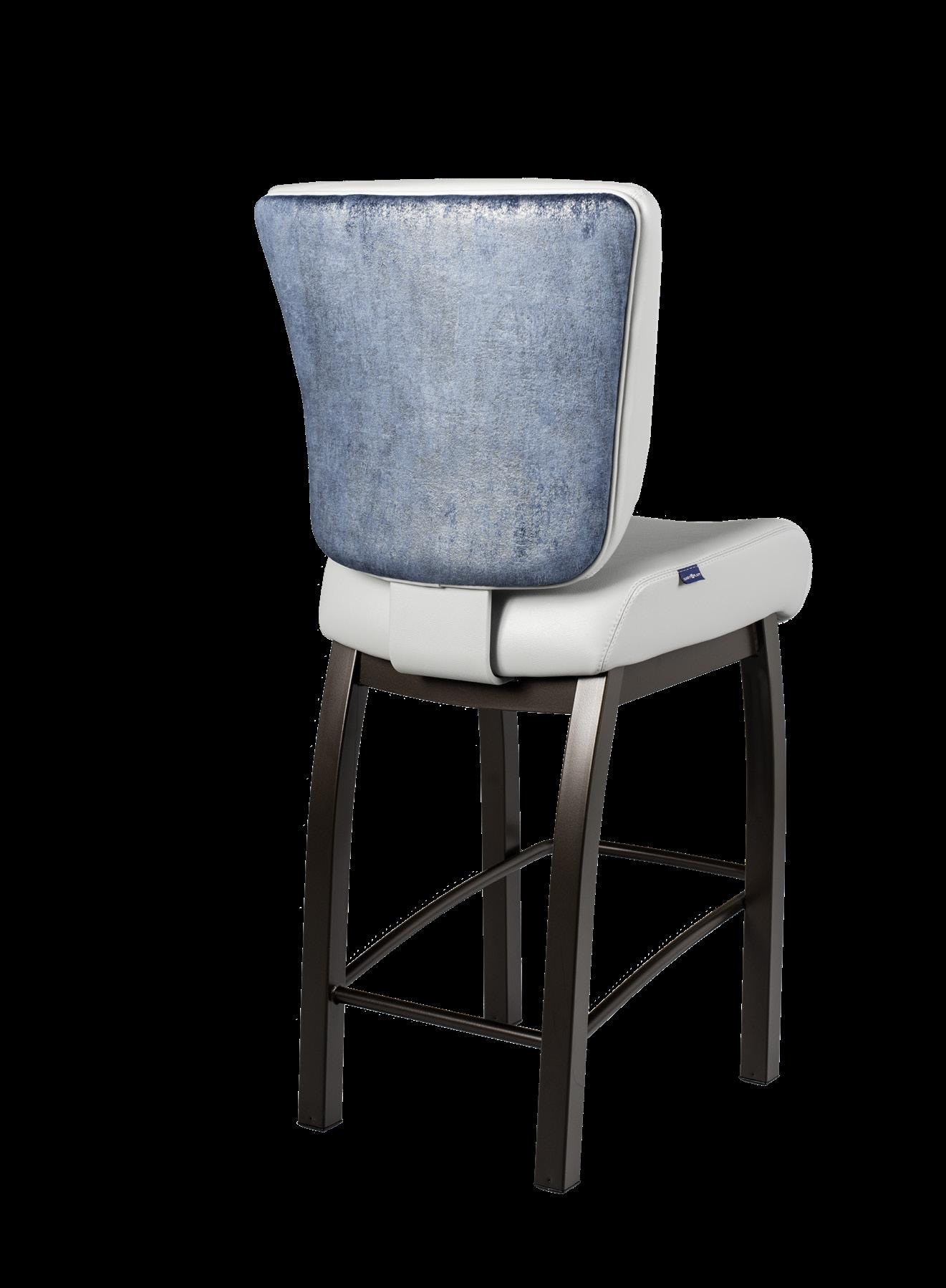 Style: Monaco Seat Width: 19” Seat Height: 19” Base: LX2 Designer with Stretchers Inside Back and Seat Upholstery: GMF Fabulous Glacier Outside Back Upholstery: Architex Lavish Navy Upgrades: Decorative Nails, Metal Insert Handle Monaco
