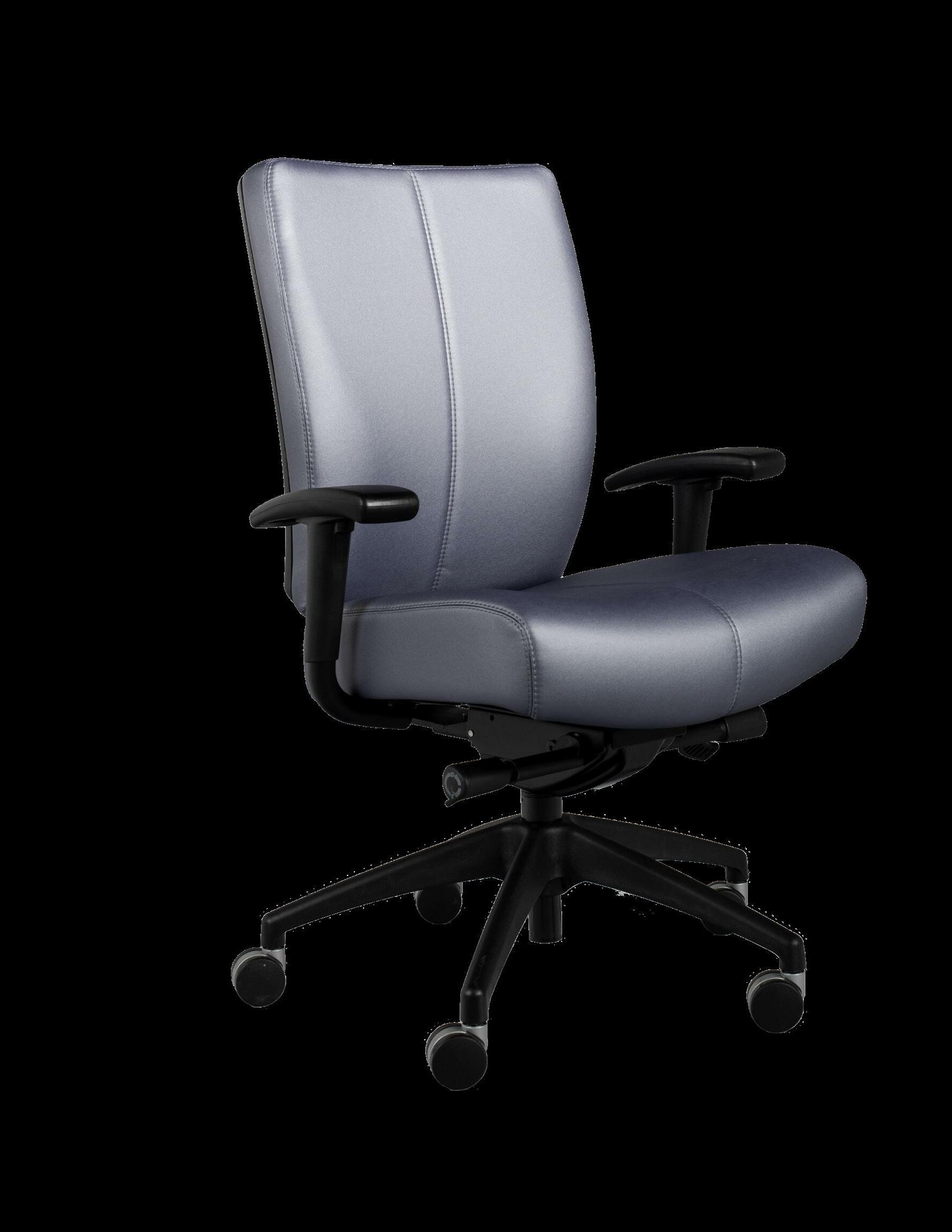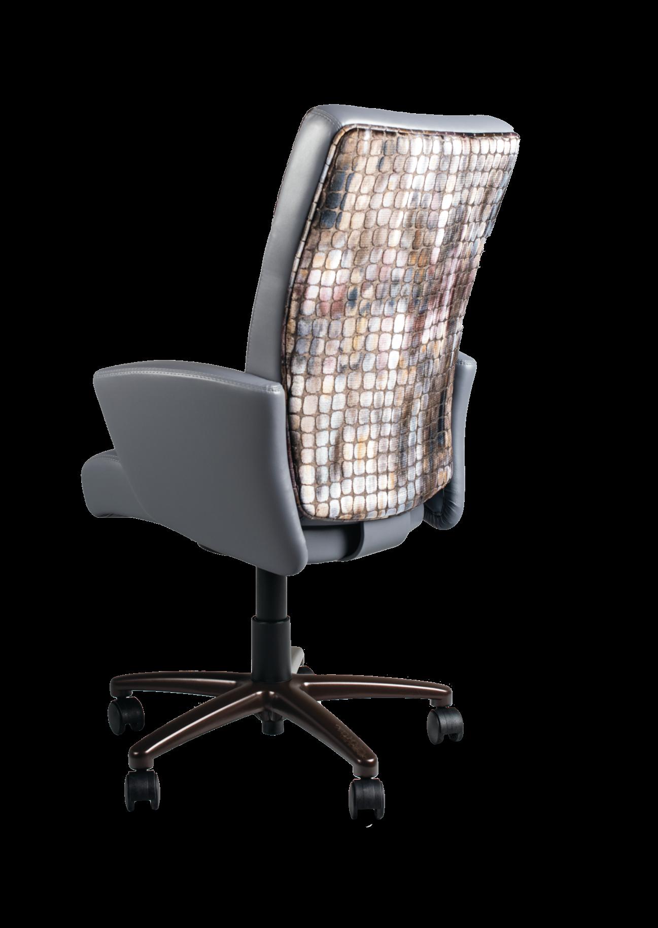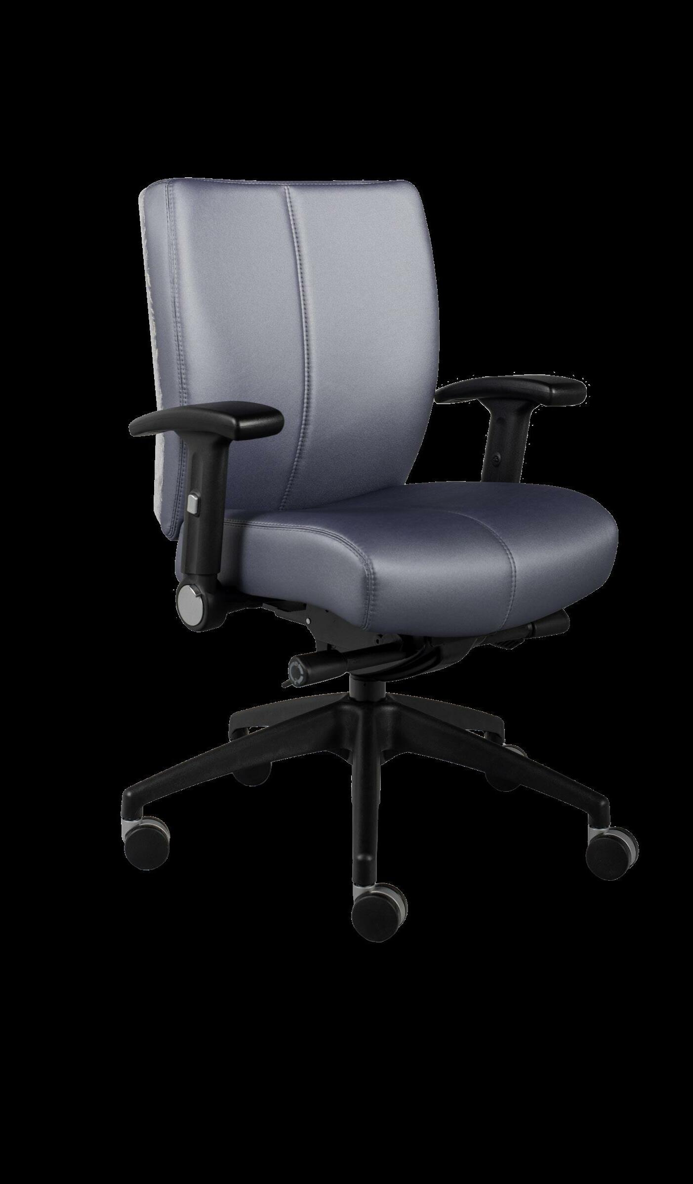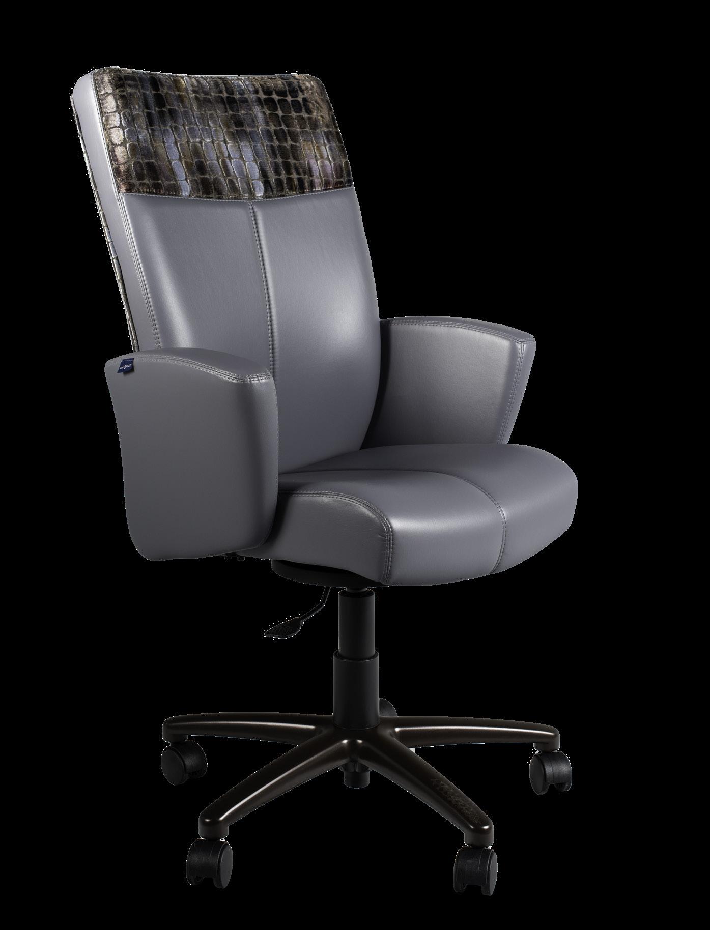Style: Lugano Executive Seat Width: 19” Seat Height: 18.5-22.5” Base: Aluminum 5-Prong Inside Back and Seat Upholstery: Ultraleather Pro Char Outside Back Upholstery: Zinc Tobia Multi Lugano Specifications Executive 23