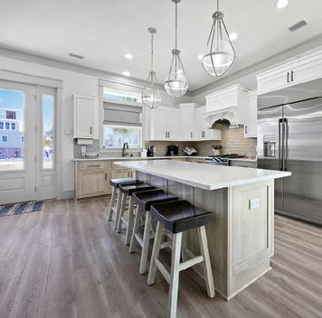 the open and spacious living area. There are 9-foot ceilings throughout, 11-foot double trayed ceiling in the living room, and 10-foot single trayed ceiling in the primary bedroom. The kitchen features a large center island with space for bar seating, a large walk-in pantry, disposal, and water filtration system as well as stainless steel appliances including a smooth top range, microwave, and dishwasher. Standard features of this home include beautiful cabinetry in ivory, granite countertops with undermount sinks in the kitchen and all bathrooms, 5 panel wood doors and engineered vinyl plank flooring throughout the entire home. The primary bedroom features a large bath with double vanity sinks, and a large closet. WindMark Beach is a tranquil community where one can enjoy the natural settings with boardwalks, walking paths, bike trails, and deeded beach access. WindMark Beach also offers residents numerous luxury amenities and features including a community pool, a gym, restaurants, packaging store/bar, beach equipment rentals, roving security, community fire pit, local shopping, and a versatile community center. a large bath with separate shower and large soak tub. Windmark Beach offers residents numerous luxury amenities and features including a community pool, easy access to the beach, and a versatile community center space perfect for special occasions and events. Outdoor music festivals are hosted throughout the year creating a fluid indoor-outdoor lifestyle.