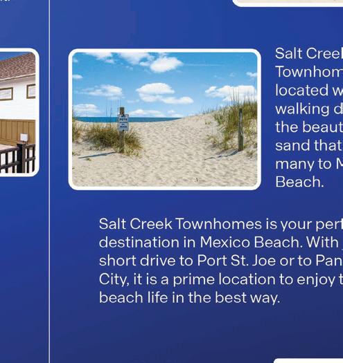 Introducing Salt Creek, the newest townhouse development in Mexico Beach. Nestled on the eastern edge of Bay County, these thoughtfully designed townhomes offer either 4 bedrooms and 2.5 bathrooms or 3 bedrooms and 2.5 bathrooms, featuring modern amenities such as quartz countertops, stainless steel appliances, and EVP flooring throughout. Crafted with quality in mind, each home boasts Color-Plus Hardie Board exteriors, complemented by Prairie-Style Doors and 30-year dimensional shingles. Convenience meets security with steel garage doors equipped with openers, weatherproof outlets, hose bibs, and Kwikset deadbolts on all exterior doors. Enjoy peace of mind with fully sodded yards, energy-efficient cooling and heating systems, Low-E insulated windows with screens, and water-saving elongated commodes.