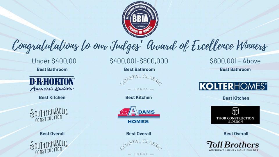 Each of these winners will be recognized at the BBIA Christmas Banquet & Installation of Officers later this year, where we’ll honor the best in the industry and celebrate another successful Parade of Homes.