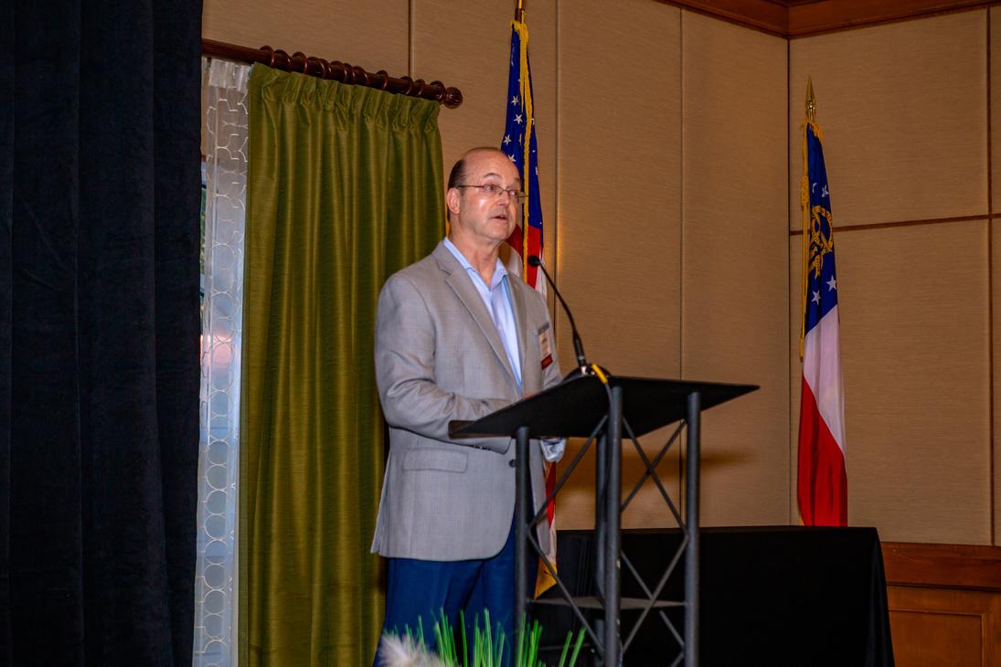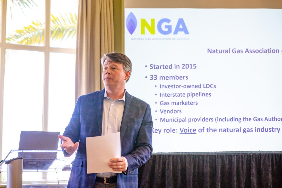 It is always a welcome sight to see meeting guests begin to arrive and hear the laughter and conversations of familiar voices and friendly faces Some guests arrived early for the pre-conference session which included guest speakers, Erin Kurilla, APGA, and Stephen Loftin, NGA. Erin provided a natural gas utility update from the federal perspective and shared the anti-fossil fuel sentiment that has become the language of the opposition She highlighted states that have acted for energy choice as well as natural gas bans and shared that federal litigation has recently struck down the City of Berkeley’s ban on new natural gas hookups due to a preemptive U.S. federal law. She also discussed APGA’s advocacy efforts, the PHMSA Grant Program, and APGA’s annual awards submissions for member systems. Stephen Loftin then took the podium to share the history of the Natural Gas Association of Georgia -the VOICE of the natural gas industry for Georgia He shared the main purpose of NGA is to educate the public on the facts and educate the policy makers on the issues facing the natural gas industry