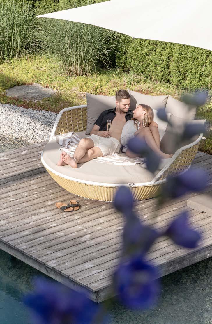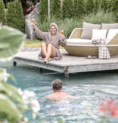Im Loungesessel zum Nicht-mehr-aufstehen wollen oder auf einer der Ruheinseln am Naturpool. Ein spannendes Buch oder einen spritzigen Aperol in der Hand, zur Erfrischung ein Sprung ins Wasser wagen oder von der Sauna den Blick auf die umliegende Bergwelt richten. Hier will man nicht mehr weg – und wenn der Herbst dann schließlich übers Land zieht, erst recht nicht.